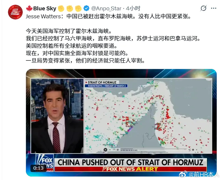福克斯新闻主持人杰西·沃特斯(Jesse Watters)3月4日晚的《Jesse Watters Primetime》节目中表示:“中国已被赶出霍尔木兹海峡,没有人比中国更紧张。今天,美国海军控制了霍尔木兹海峡。我们已经控制马六甲海峡、直布罗陀海峡、苏伊士运河和巴拿马运河。美国掌握所有全球航运咽喉要道。现在,对中国实施全面海军封锁已成为可能。一旦局势紧张,其经济将任人宰割。”