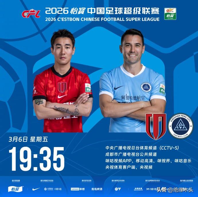 春风吹,战鼓擂,这个世界谁怕谁? 中超第一轮今日开战! 今天晚上中超开幕式&成都蓉城首战深圳新鹏城!多个平台转播,球迷可以免费看球!转播平台:中央广播电视总台体育频道(CCTV-5)、成都市广播电视台公共频道、咪咕视频APP、移动高清、咪视界、咪咕音乐、央视体育客户端、央视频! 成都蓉城VS深圳新鹏城的比赛还是有很多看点的。不仅仅是成都蓉城新帅第一场中超比赛,很多人估计会拿他和前主帅徐正源进行对比。再加上前成都蓉城的队长效力4年的周定洋恰恰新赛季在新鹏城,第一场就面对旧主,估计成都蓉城球迷也心情复杂~~ 成都蓉城也是今年冠军的热门人选。不仅仅是多位媒体人预测它很可能是2026赛季冠军,就连某网站的球迷预测中超50%都认为成都蓉城是冠军的可能性最大。 所以开幕式+首战+冠军热门+战旧主...... 这一场BUFF+的不少,吸引了相当多的目光~
