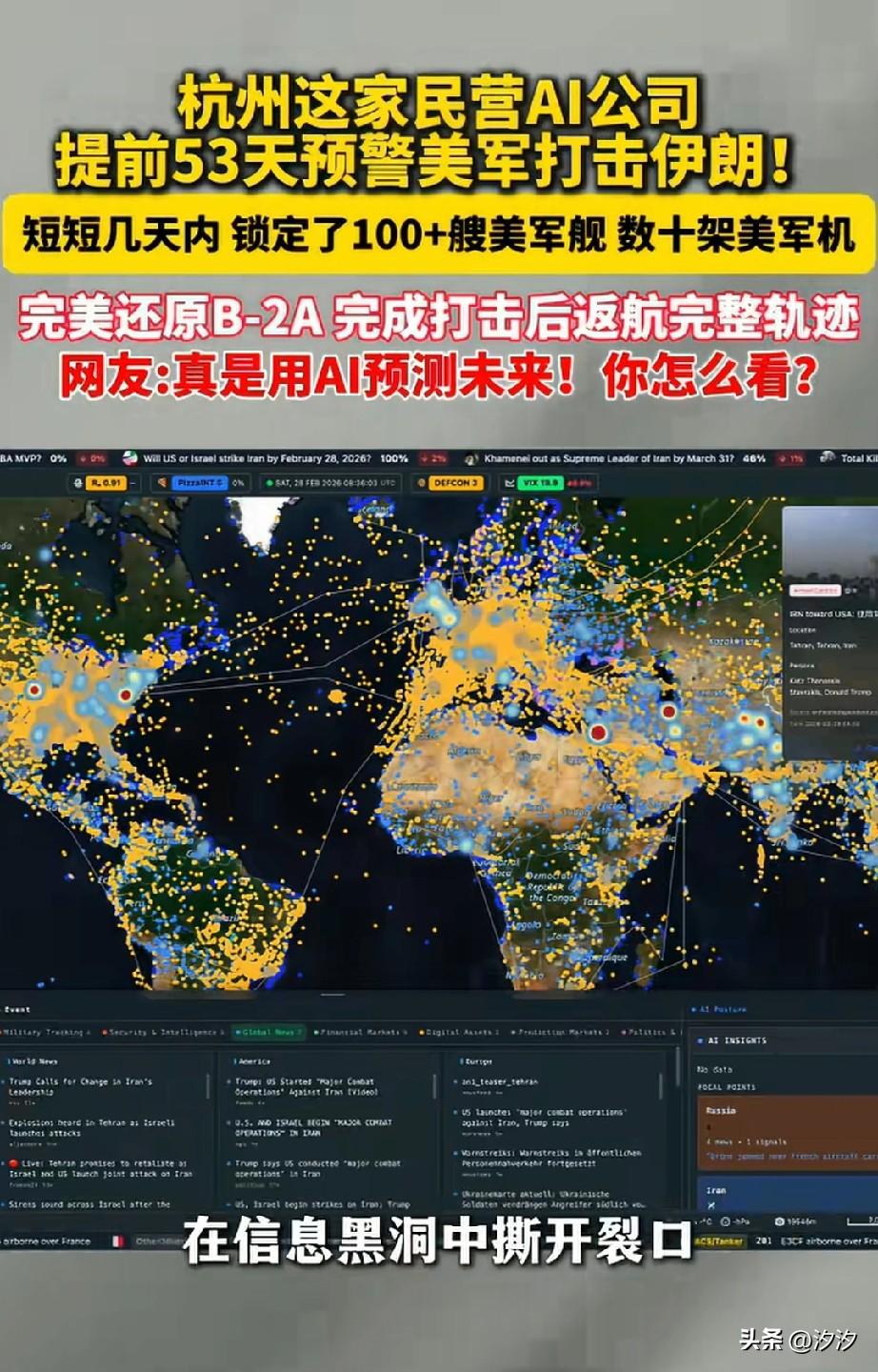 杭州这家民营AI公司, 居然提前52天预测了美军打击伊朗的行动,还在1月6号的时候发布了,下一站伊朗,美军是否要对伊朗开启新一轮打击?这也太厉害了吧, 当时当发生了美军逮捕委内瑞拉总统马杜罗的大事件, 这家民营公司的AI就开始监测美军的下一步行动,他们精确的监控到了, 美国军舰100多条军舰的动向, 和数10架美军飞机的轨迹, 一切都在证明美军在酝酿一个大的阴谋,而且是针对伊朗行动, 这提前52天的预警, 在3月份居然发生了, 尽管美国飞机开启了隐身模式, 全程静默, 但是在AI的眼中, 一切都是透明的, 他们居然精准的预判了美军的行动, 靖安科技公司在3月2日的发文中, AI全程监控了美军轰炸伊朗后, 经过芝普罗特海峡返航的全部经过, 还公布了战斗机驾驶员的通话记录, 这也太发达了吧? 如果以后AI拥有了自主意识, 那将是人类的灾难? 美国对伊朗开战 美军攻打伊朗 美国对伊朗空袭 伊朗命中目标