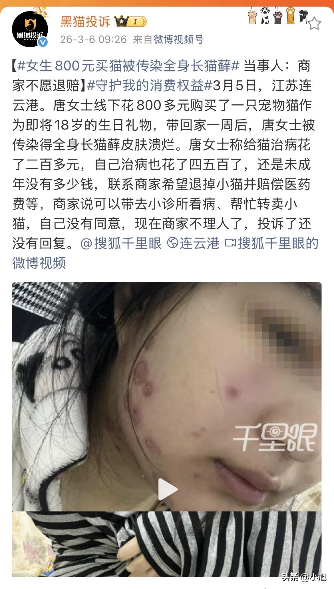 江苏连云港一个女孩,还有几天才满18岁,花800多块钱买了只小猫,想送给自己当成人礼。结果带回家才一周,女孩全身开始长痘,皮肤溃烂。 女孩自己还是个学生,没成年也没啥钱。给猫治病花了二百多,自己看皮肤又花了四五百,加起来快顶上买猫的钱了。她去找卖猫的商家,想把猫退了,再把医药费赔了。 商家给的方案是什么?说可以带去小诊所看看病,或者帮她把这猫转卖给别人。女孩没同意,商家干脆就不理人了。 现在女孩投诉了,还没回复。 这猫藓传染性很强,女孩身上长得到处都是,又痒又疼,皮肤都烂了。她一个快过18岁生日的小姑娘,本来高高兴兴想养个宠物陪自己,结果弄成这样。 猫藓是真菌感染,人畜共患。这只猫买回来的时候很可能已经带病了,只是还在潜伏期没发作。商家卖的时候有没有给猫做过健康检查?有没有告诉女孩这猫的真实情况? 女孩还是未成年人,法律上属于限制民事行为能力人。她花800多块买猫,这笔交易如果家长不追认,是可以主张无效的。再加上猫本身可能带病,商家如果知情不报,那就是欺诈。 现在商家直接玩消失,不理人了。小姑娘投诉无门,医药费花了,生日礼物也成了麻烦。 你们遇到过类似情况吗?买宠物要是买到病猫,你觉得商家该不该赔医药费?