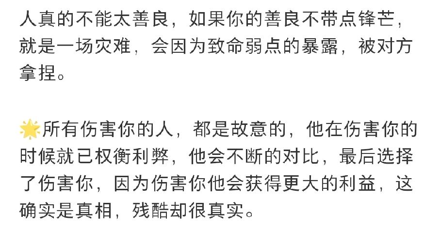 亲情之间的善良, 还不如道边的陌生人…… 老一辈的善良, 是没有任何目的性的,非常纯粹。 我爷爷兄弟5个,爷爷是老大, 他14岁跟着打井队伍去天津那边打井, 吃了不少苦,受了不少罪, 20多岁结婚, 那时候工资就几十块钱, 在村里来说不少了…… 爷爷一直帮助他的兄弟姐妹, 只要发工资都会有弟弟妹妹的份儿, 爷爷的妹妹觉得理所应当, 我奶奶一声不吭…… 后来, 我爷爷妹妹家孩子小日子都过起来了, 我爷爷的孩子们的生活却不如意, 爷爷妹妹家的孩子躲得远远的, 生怕我爸哥几个问他们借钱…… 人啊,光善良不行的, 所以说, 善良要有度, 而且要略带锋芒[灵光一闪]