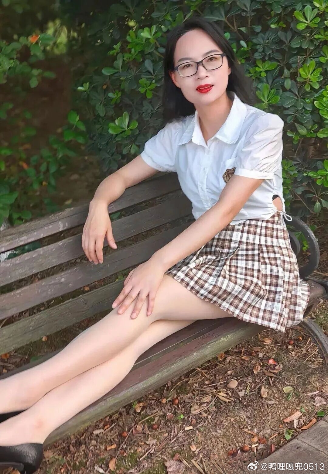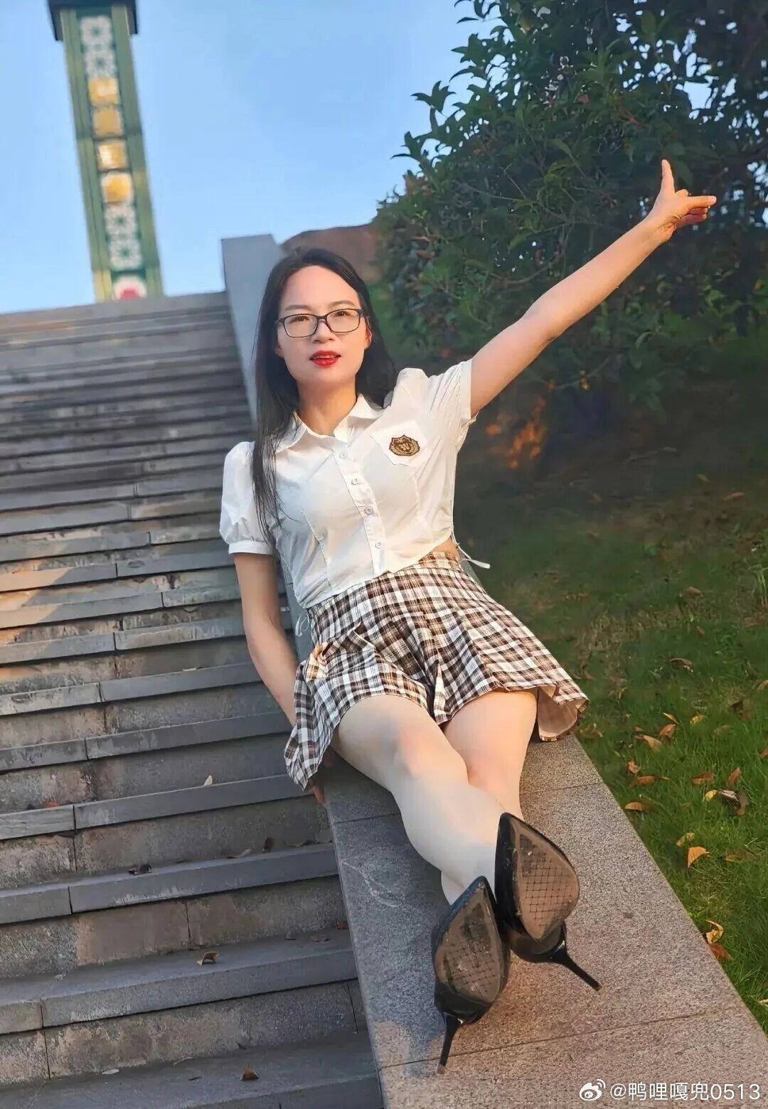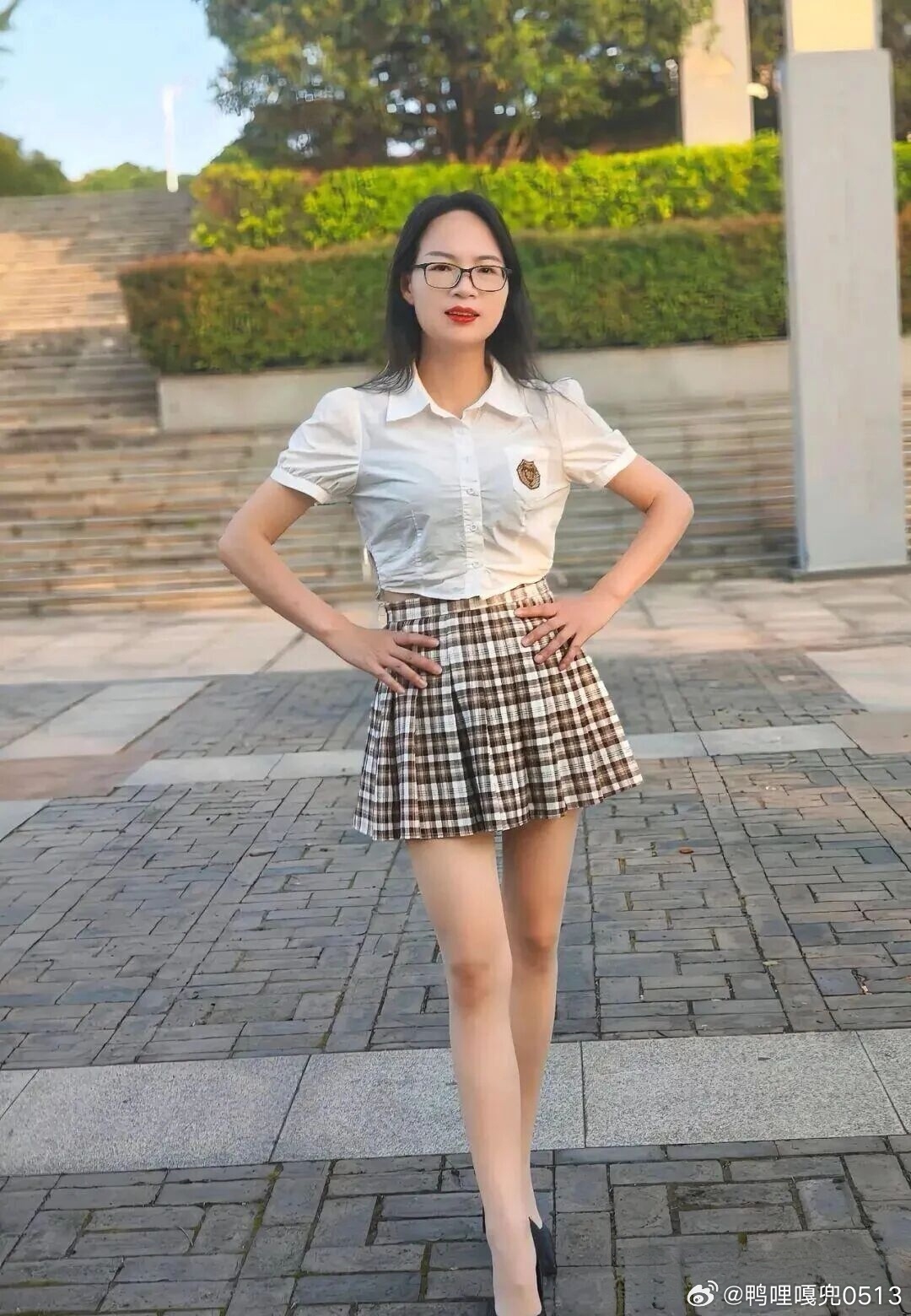 写真 格子裙白衬衫青春靓丽