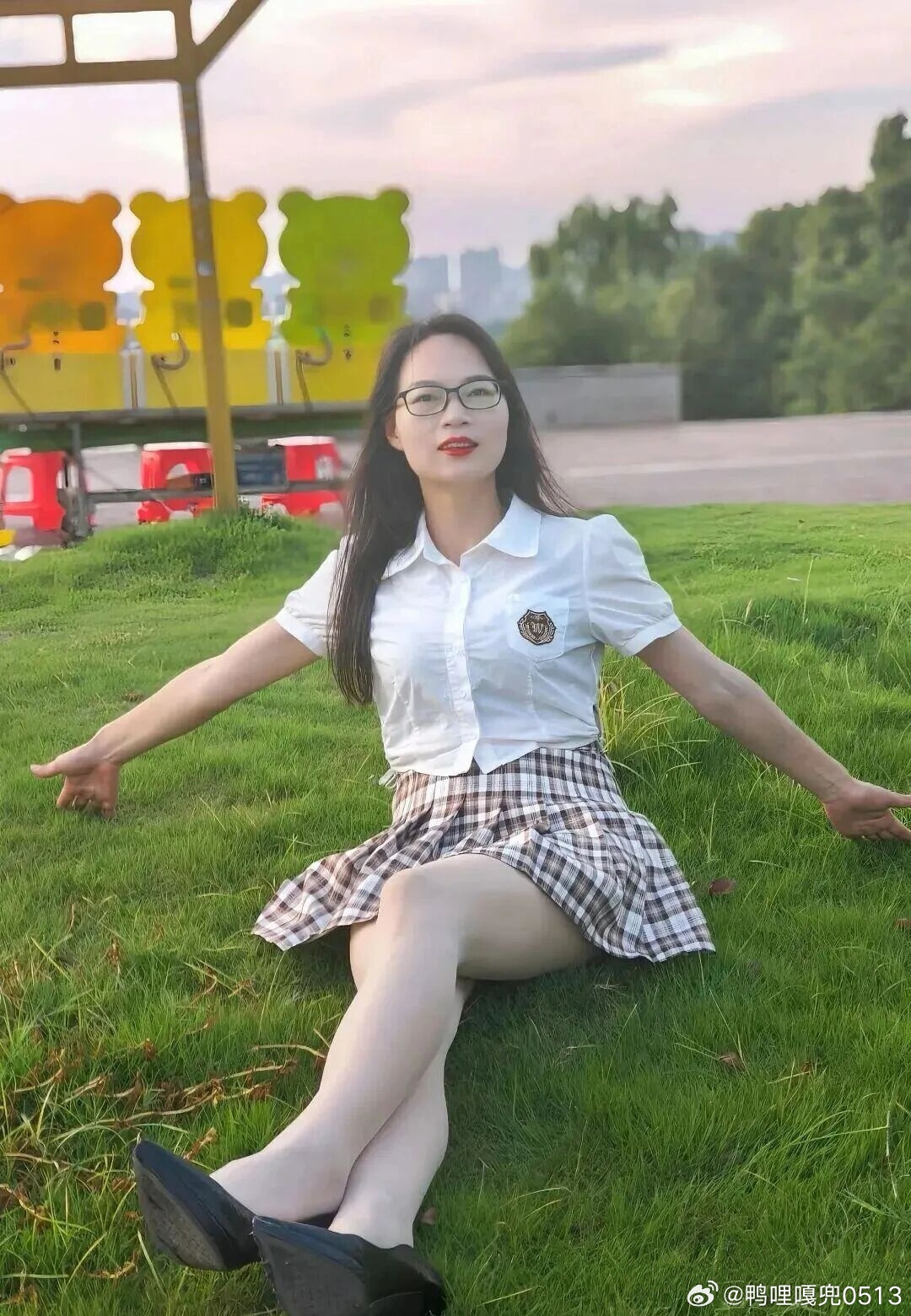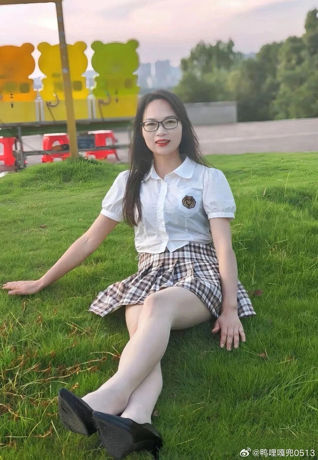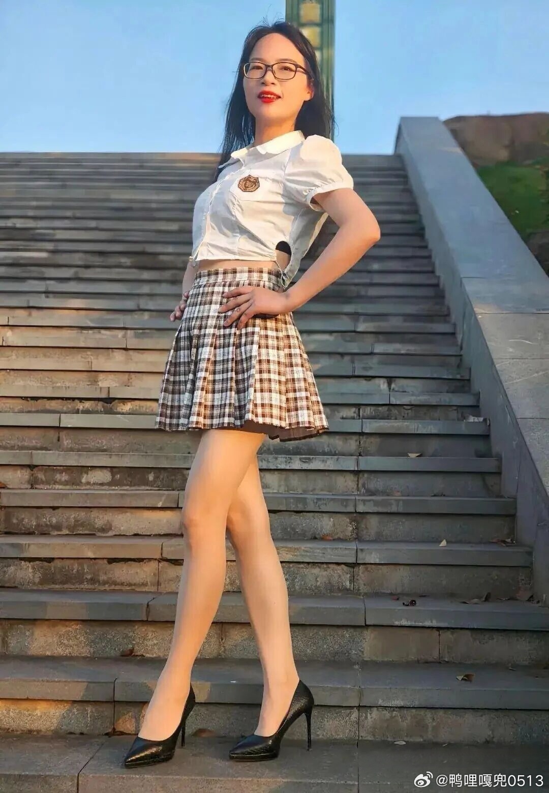 写真 格子裙白衬衫青春靓丽