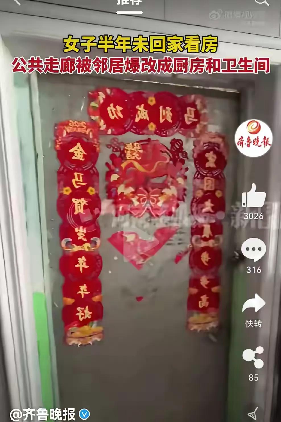 内蒙古,邻居把过道改成了厨房和卫生间,还把女子的闲置房子圈了进去,所以女子进屋还得经过对方同意,不然对方不开门,女子就无法进入自己的房子内。她向大家求助,这种情况该如何维权? 这事听着就离谱,谁能想到自己半年没回家,再回来时家门都快成了邻居家的“内门”。公共走廊本来是整层住户共享的通行空间,结果被硬生生隔出了灶台、水槽,甚至还摆上了马桶,连通风和下水都没处理好,活脱脱把逃生通道改成了私人生活间。更让人窝火的是,邻居直接把女子的房门圈进了自己改造的区域里,等于把别人的家锁在了自己的“地盘”里,想进自己屋得先看邻居脸色,对方不乐意开门,业主连家门都摸不到。 这种操作说白了就是明抢,既违反了《民法典》里关于业主共有部分的规定,也踩了消防和物业的红线。公共区域不是谁家的自留地,哪怕占了一寸,都是在侵犯其他业主的合法权益,更别说改造成有明火和排污需求的厨卫,一旦发生火灾或者管道泄漏,整层楼都要跟着担风险。 很多人遇到这种事第一反应是吵架,但硬碰硬往往解决不了问题,反而容易把矛盾闹得更僵。最有效的办法还是走正规流程,先固定证据,把改造后的走廊、被圈住的房门、邻居私装的设施都拍下来,留好视频和照片。接着找物业和社区出面协调,这是他们的职责所在,必须要求对方限期拆除违建、恢复走廊原貌。 要是邻居耍无赖不肯配合,就直接向城管和消防部门举报,占用消防通道、违规改造房屋都是明确的违法行为,相关部门有权力强制整改。最后一步才是走法律途径,起诉对方侵占物权,要求赔偿损失、恢复通行权,这种案子只要证据扎实,胜诉的概率非常大。 最让人无奈的是,这类“霸占公共空间”的事在老小区和公寓楼里并不少见,有人觉得“占了就是我的”,有人怕麻烦不敢出头,结果让投机者越来越嚣张。公共区域的意义就在于“共享”,任何私人占用都是在透支所有人的安全和便利,今天邻居能改厨房卫生间,明天就能搭隔间、堆杂物,最后遭殃的还是整栋楼的住户。 这位女子的遭遇也给所有人提了个醒,房子哪怕长期不住,也要定期和物业、邻居打个招呼,避免被人钻了空子。遇到权益被侵犯时,别想着忍气吞声,也别用暴力解决问题,拿起法律武器才是最靠谱的选择。毕竟自己的家,凭什么要靠别人施舍才能进? 各位读者你们怎么看?欢迎在评论区讨论。