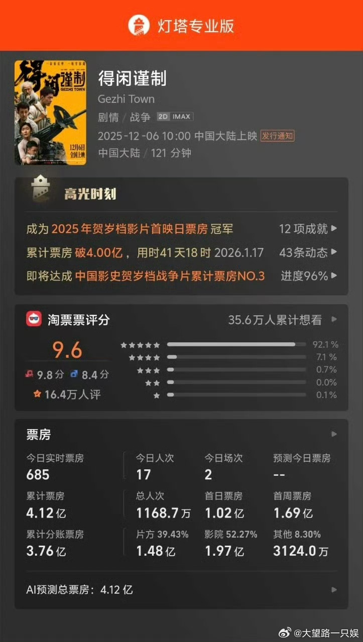 用户10xxx37 1 2026-03-07 01:51 符合预期,肯定是亏损的。正午老总侯鸿亮与导演孔笙说的,该片投资很大,非小成本片,而是个商业片。不说网传的投资4亿,就算投资2.5亿,也得7.5亿票房方可回本。现票房4.12亿,肯定该片亏损,不过这个亏损,也在侯总及孔导的预期之内吧