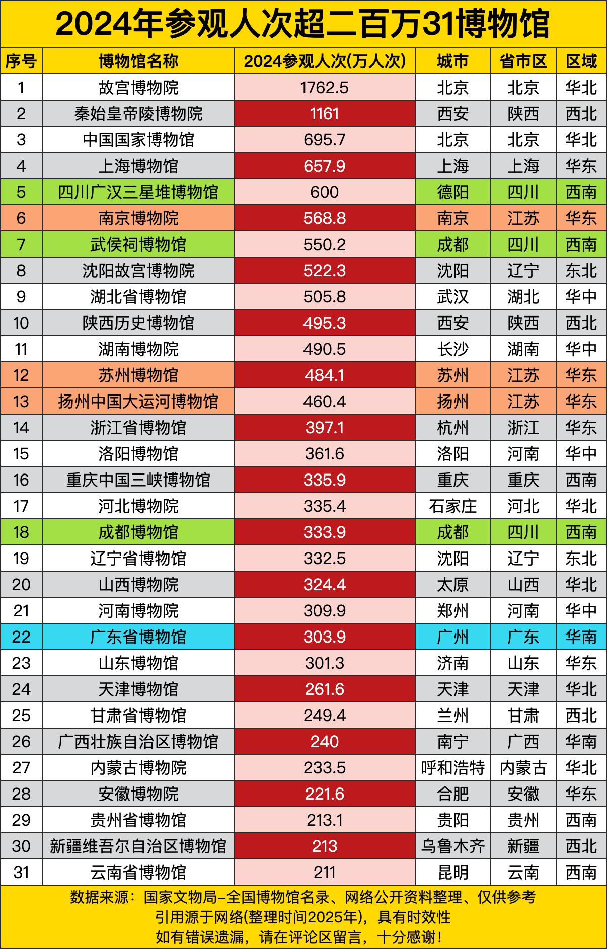 故宫博物院以1762.5万人次断层领跑,相当于每天近5万人涌入,这热度比“网红奶茶店”还猛,毕竟谁能拒绝紫禁城的红墙黄瓦呢?秦始皇帝陵博物院1161万人次紧随其后,兵马俑的“地下军团”吸引力拉满,感觉去西安不看兵马俑,就像吃火锅没放辣,少了灵魂! 中国国家博物馆695.7万人次、上海博物馆657.9万人次,这俩“国字号”和“魔都顶流”也是人气爆棚,逛国博像翻历史课本,逛上博像拆文化盲盒,各有各的精彩。四川广汉三星堆博物馆600万人次,三星堆的青铜面具太神秘,去的人都想看看“外星人”留下的宝贝,成都武侯祠550.2万人次、成都博物馆333.9万人次,成都的文化牌打得那叫一个响,三国文化和城市记忆双重暴击,游客直呼“巴适”! 南京博物院568.8万人次、湖北省博物馆505.8万人次、湖南省博物院490.5万人次,这几个“华中三巨头”也是打卡胜地,南博的文物、湖博的编钟、湘博的辛追夫人,每一件都是“镇馆之宝”级别的存在。沈阳故宫522.3万人次、辽宁省博物馆332.5万人次,东北的文化底蕴也不容小觑,故宫的红墙和博物馆的瑰宝,让游客感受“共和国长子”的文化魅力。 最后,广东省博物馆303.9万人次、广西壮族自治区博物馆240万人次、云南省博物馆211万人次,华南和西南的博物馆也是“文化后起之秀”,粤博的海洋文化、桂博的民族风情、云博的古滇故事,吸引着各地游客去探索。这些博物馆就像“文化加油站”,给人们的旅行增添了满满的知识感,看来“逛博物馆”已经成为新的旅游时尚啦!