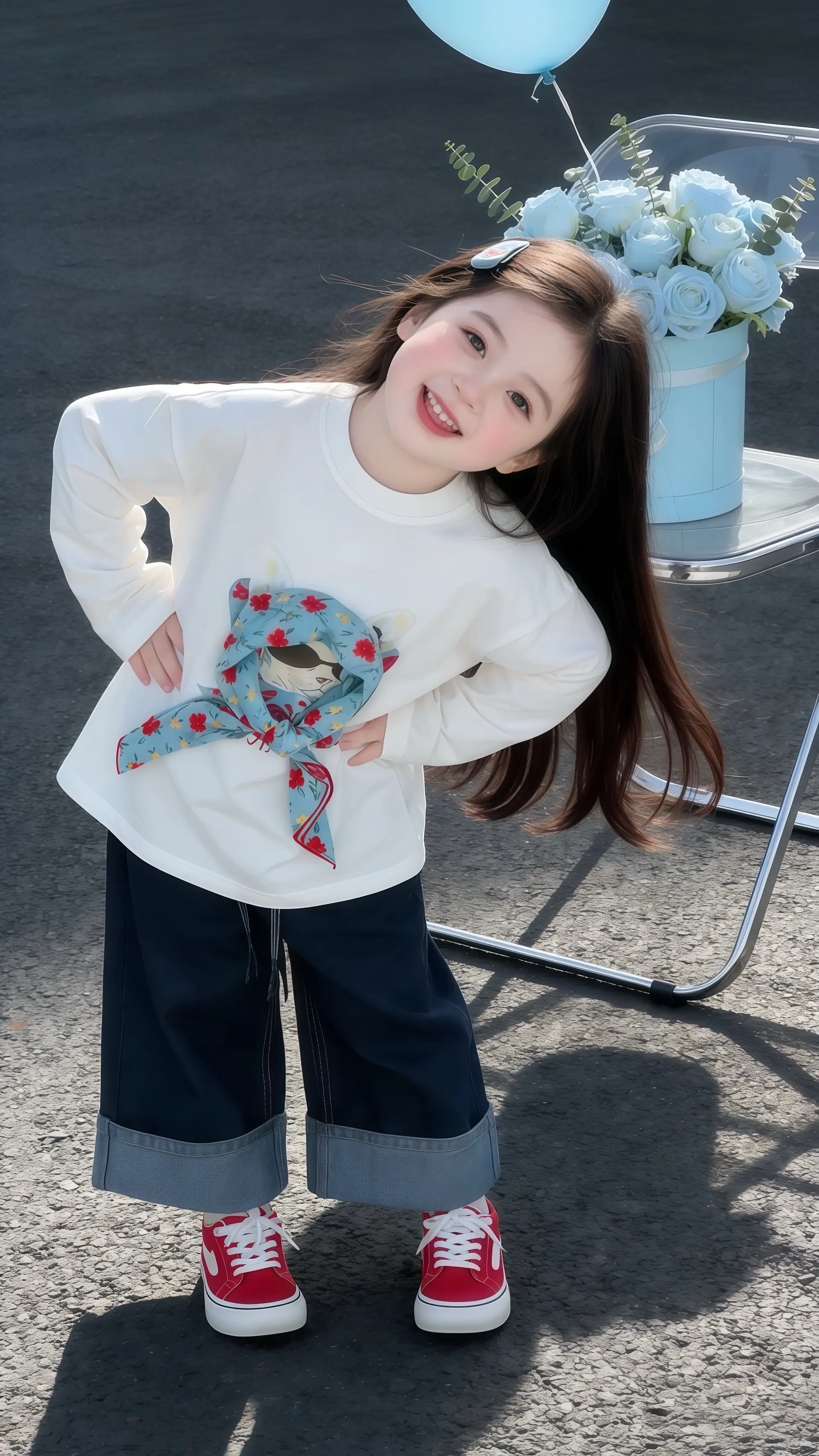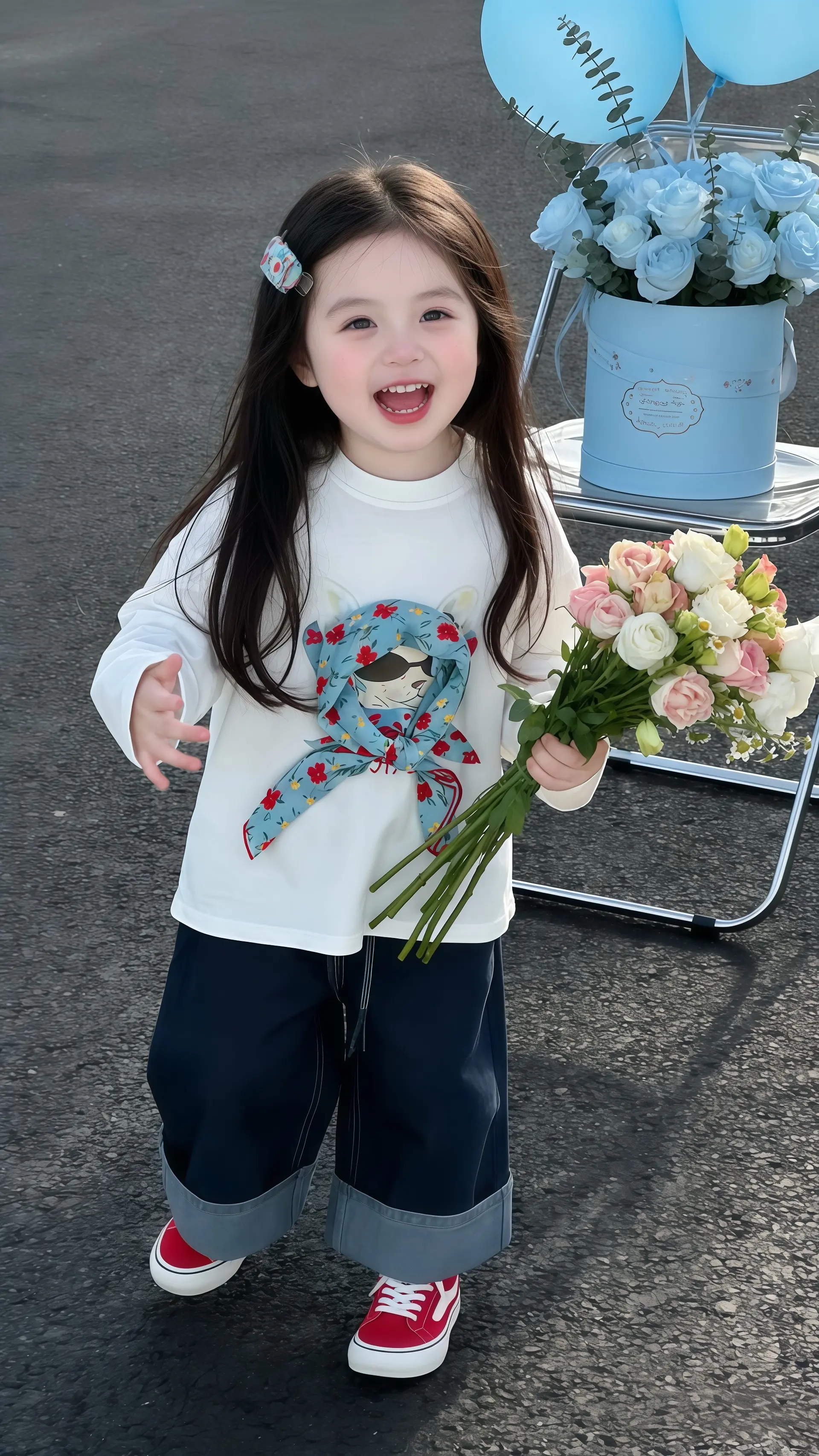 娃弯着腰笑开花,灰开衫软乎乎像“裹了片薄雾”,粉纱裙晃起来像“盛着团樱...
