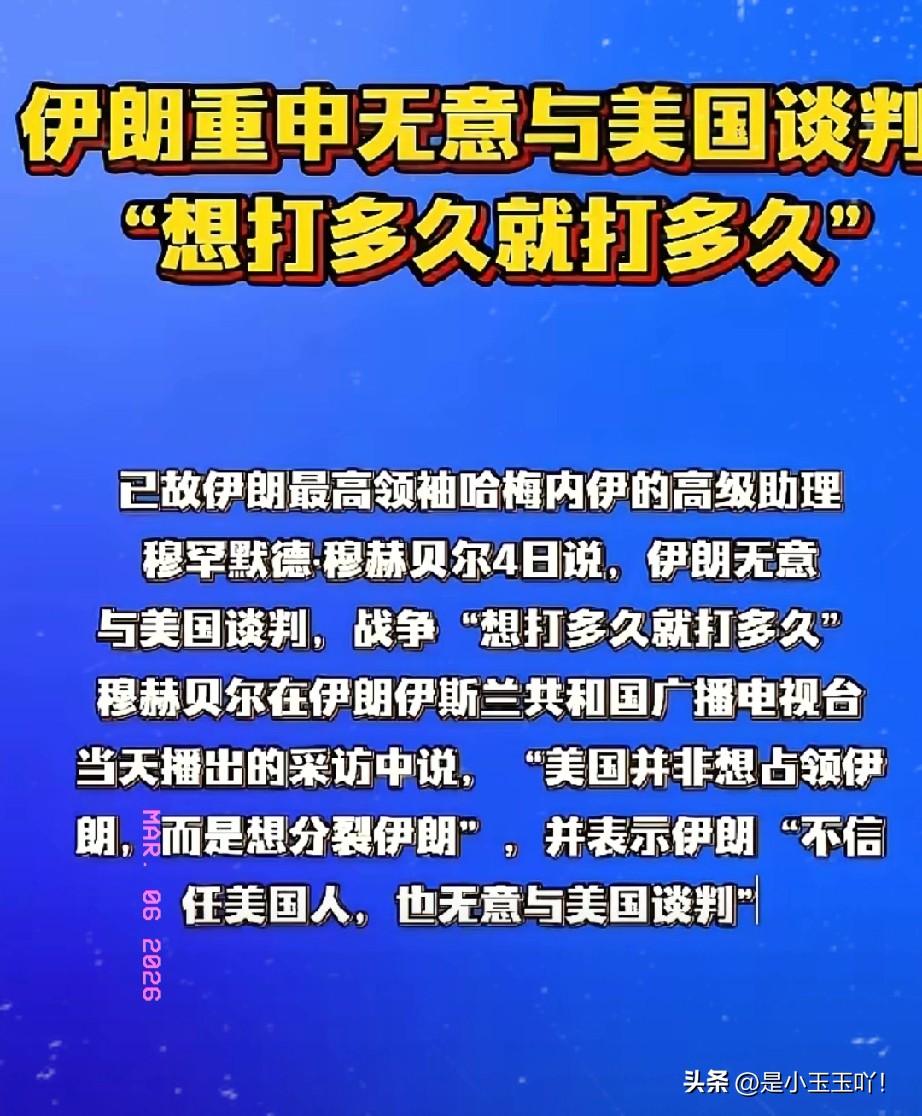 打得一拳开,免得百拳来! 伊朗明确宣告:绝不会和美国进行任何形式的对话,宁愿以赌国运的方式与美国进行对抗,也不愿屈服于美国的霸权施压 伊朗宁愿和美国“想打多久就打多久”,也要抵抗美国“想迫使我们屈膝多久就打多久”。 面对美国的威胁和施压,伊朗誓言“要打到彻底胜利”,要实现“打得一拳开,免得百拳来”的理想境界。
