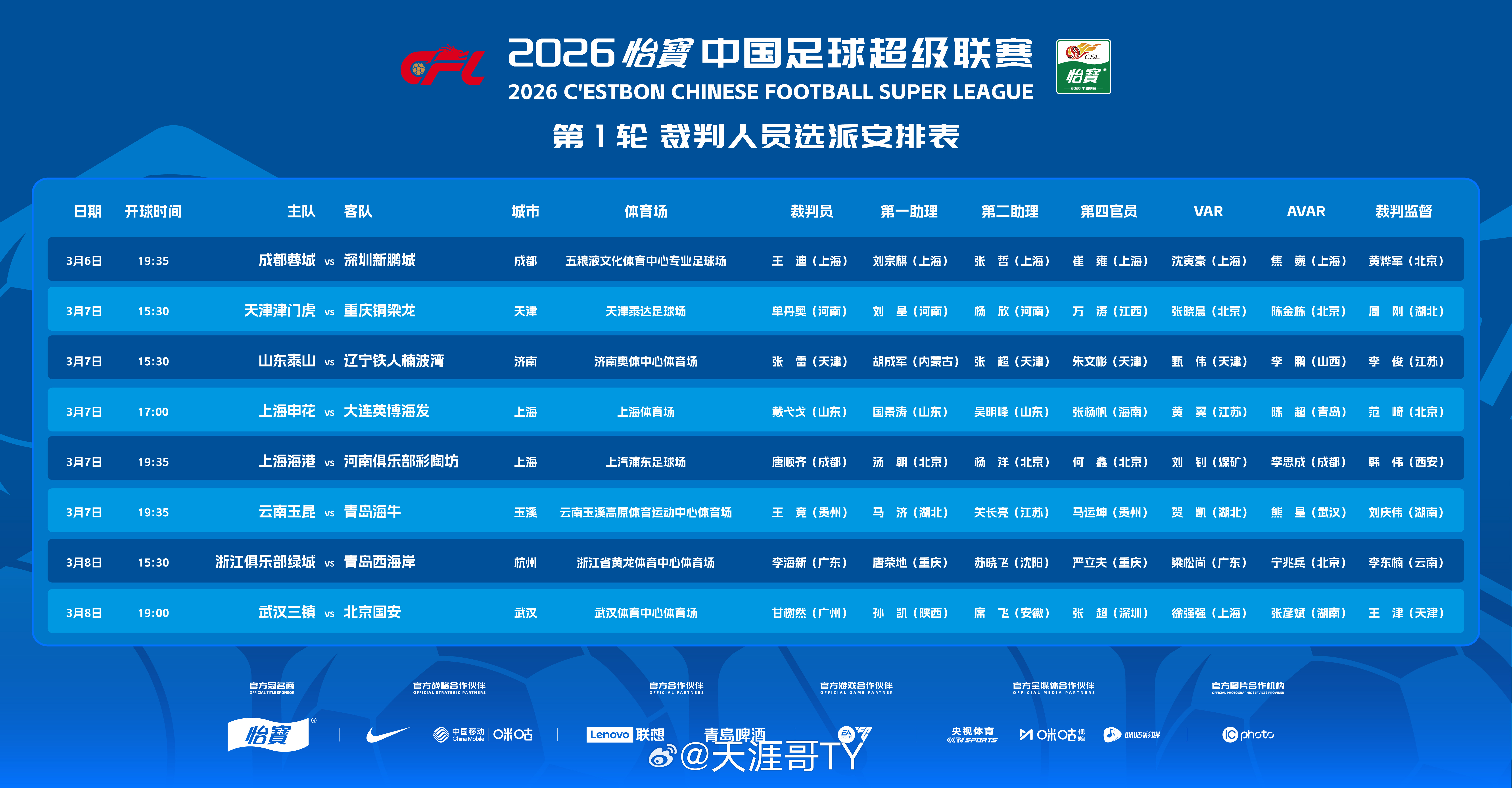 山东泰山 2026赛季中国足球超级联赛第一轮山东泰山vs辽宁铁人 比赛时间:2026.3.7日15:30分比赛地点:济南奥体中心体育场主裁判:张雷(天津)第一助理裁判:胡成军(内蒙古)第二助理裁判:张超(天津)视频助理裁判:甄伟(天津)泰山🧡必胜👊🏻