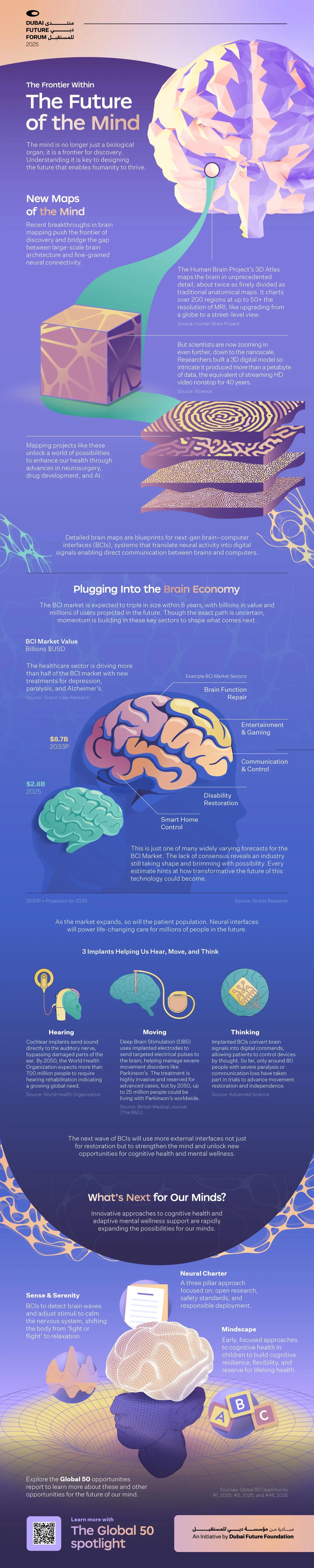 探索大脑:未来前沿领域 大脑不再仅仅是一个生物器官;它已成为一个有待探索的领域。通过前所未有的高精度脑部扫描以及对脑机接口(BCI)的大量投入,我们得以开启一系列提升健康状况的可能性。 与迪拜未来论坛合作(该论坛每年 11 月在迪拜举行,是全球规模最大的未来学家盛会),这张图表展示了探索、投资和创新是如何相互融合,从而改变我们对大脑的理解的。 ——探索大脑:大脑绘图 “人类大脑项目”的三维图谱对大脑的描绘比以往的图谱更为精细两倍。它详细标注了超过 200 个区域,其分辨率是核磁共振成像技术的 50 倍,就像是将地图从全球视角升级为街道层面的视角。 但科学家们如今正致力于探索纳米尺度领域。研究人员构建了一个极其复杂的三维数字模型,其产生的数据量超过了1千万亿字节(相当于 40 年不间断播放高清视频所需的数据量)。 像这样的项目进行起来后,将为我们带来诸多可能性,从而通过神经外科手术、药物研发以及人工智能等领域的进步来提升我们的健康水平。 ——融入“大脑经济”体系 预计到 2033 年,BCI 市场的规模将扩大三倍,达到约 87 亿美元的预估市场规模。其价值可能会分布在多个关键领域,包括:功能修复、娱乐、通信、残疾恢复以及智能家居控制。 这只是众多关于 BCI 行业的市场预测之一,不同来源的预测结果差异很大。随着 BCI 行业的不断发展,这种多样性预示着该市场充满了无限可能。 ——展望未来:大脑的未来 随着市场的不断扩大,患者群体规模也将随之增加。下一波BCI技术的应用不仅有望帮助患者恢复健康,还有可能增强人的思维能力,并为认知健康和心理健康开辟新的机遇。