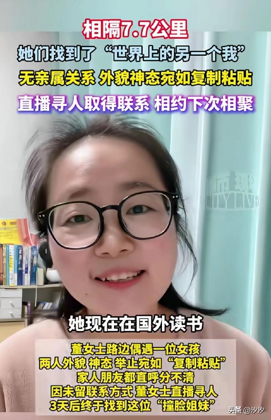 中国真的是一个很大的基因库, 两个没有血缘关系的人居然长得这么像, 河南洛阳的董小姐一次偶然的机会, 居然在高速上看到了和自己长得一样的人,随后发视频求助网友, 最终联系了女孩的朋友, 和女孩取得了联系, 原来两个人的家相距7.7公里, 女孩目前在国外读书, 回国了就联系她, 想和她一起共进晚餐, 毕竟这样的缘分真的很神奇, 谁能想到没有血缘关系还能长得这么像, 就连董女士的家人和朋友都分不清楚两人, 大家觉得这是不是缘分?