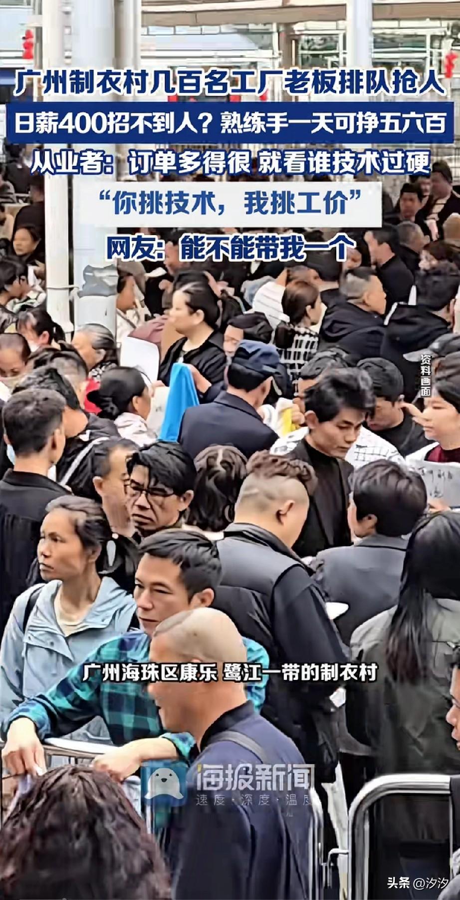 今日广东制衣村火了, 这里把一个球场改造成了零工市场, 数百名老板每天拿着衣服招人, 虽然不知道今年生意怎么样, 但还是想把人招进来, 看到返回的工人就开心, 一天400块钱真的很多了, 很多人都在挑工作, 毕竟短期一个月能挣好几万, 这样的活谁不干?
