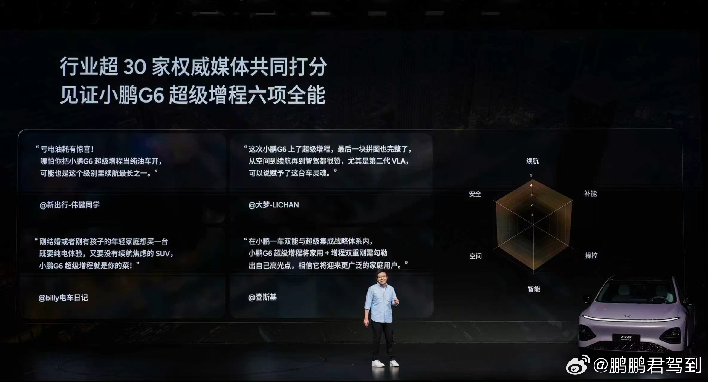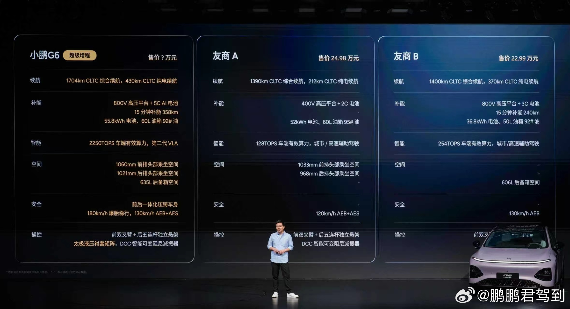 ✅ 六项全能,一步到位- 【同级综合续航第一】1704km全球最长综合续航,430km纯电通勤一周不充- 【同级补能速度第一】20万级唯一全系标配800V+5C,12分钟补能314km- 【同级车端有效算力第一】至高2250TOPS,搭载第二代VLA物理世界大模型,L4级智驾能力首次下放20万级- 【同级空间得房率第一】85.6%得房率,前排1060mm、后排1021mm头部空间,635L后备箱可扩展至1740L- 【同级最强主动安全】180km/h高速爆胎稳行,130km/h AEB+AES,12000T前后一体式铝压铸车身- 【同级最强底盘】前双叉臂后五连杆+太极液压衬套+DCC智能可变阻尼减振器,毫秒级路况预瞄,媲美60万级豪车质感小鹏G6超级增程六项全能一步到位何小鹏称G6将第二代VLA带入20万内
