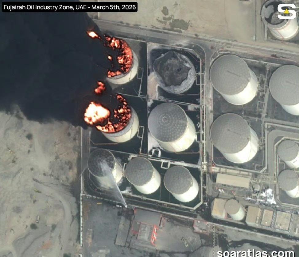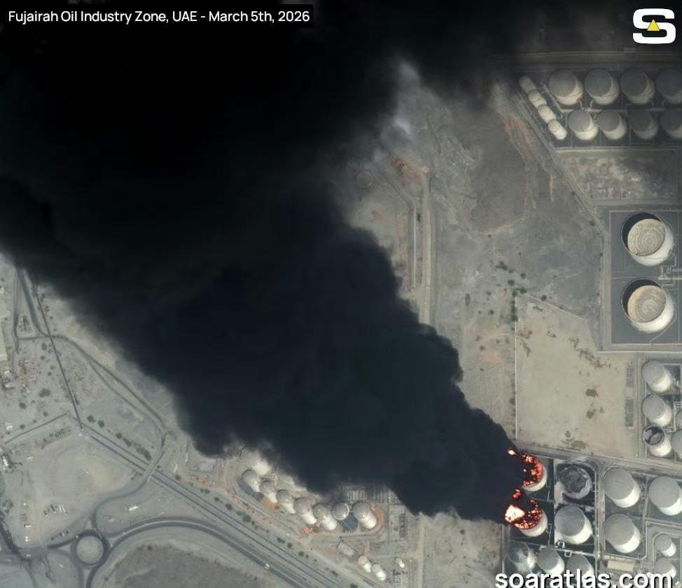 最新卫星图显示,3月3日伊朗发动袭击后,阿联酋富查伊拉石油工业区的两座油罐起火燃烧。