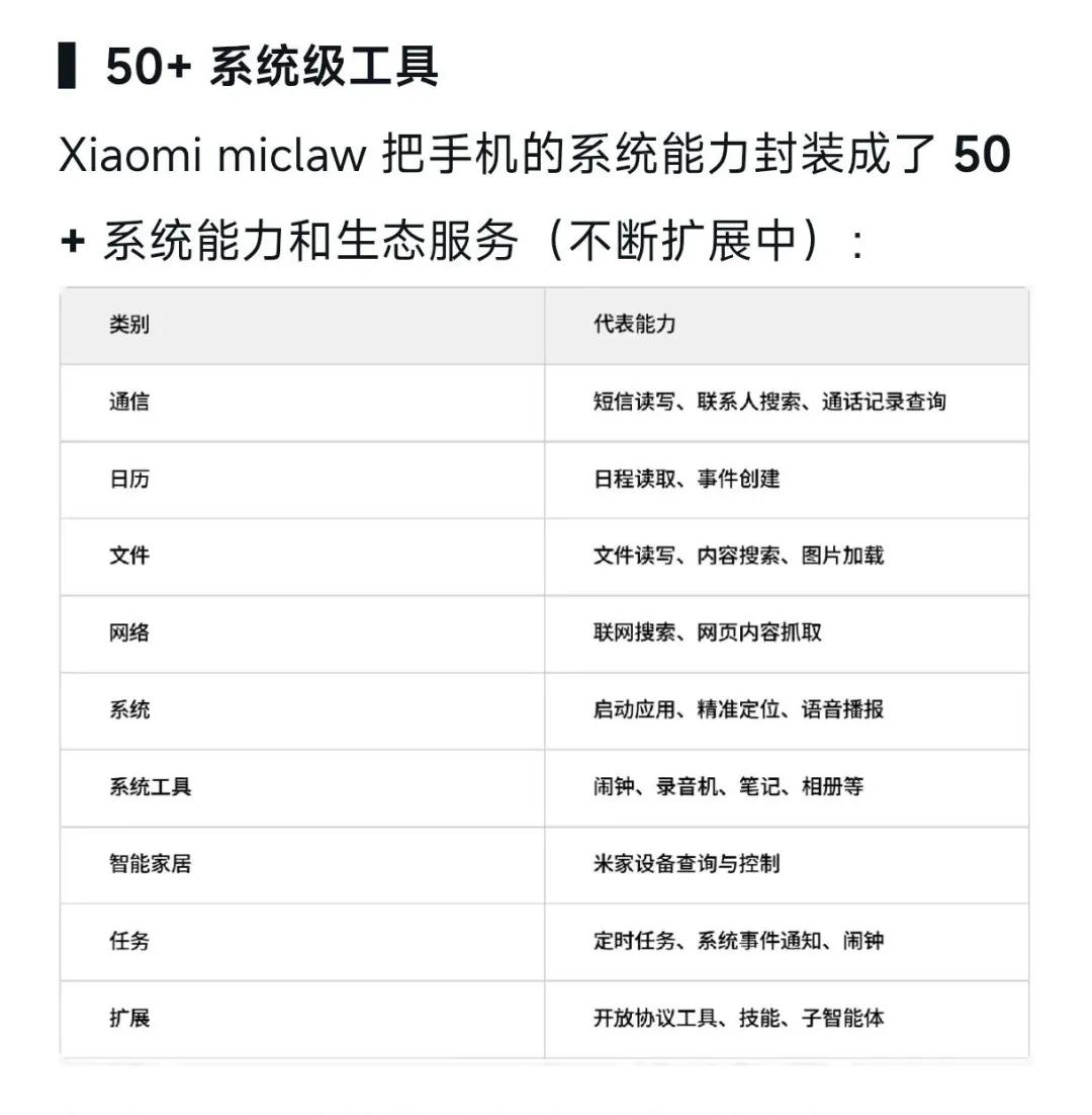 小米今天上午 10 点公布,它即将发布一款类似于 OpenClaw(即网友所说的龙虾)的 AI 产品,它的名字叫 miclaw。 如果你不知道 OpenClaw 是什么东西,你可以在网上搜一下,这里就不多说了,它现在爆火。 miclaw 未正式发布,目前正在封测。我不知道怎么参加封测,感兴趣的用户可以前往澎湃更新小程序、小米社区关注最新动态。 需要注意的是,封测仅针对小米 17 系列机型,其他机型暂无计划。 miclaw 需要底层系统权限的支持,所以小米会向成功申请了内测的用户,推送单独的固件更新,以适配 miclaw。这也意味着,其他澎湃 OS 版本就算单独安装了 miclaw 应用,也不能正常使用。 小米解释说,miclaw 获得的底层权限,可以避免它被第三方应用判定为外挂而导致封号,不会重蹈豆包手机的覆辙。 目前“超级小爱”可以直接打开抖音等少部分应用,打开后甚至还能进行有限的自动化操作,但是像微信这些应用,它是完全无能的。希望 miclaw 能有所突破。