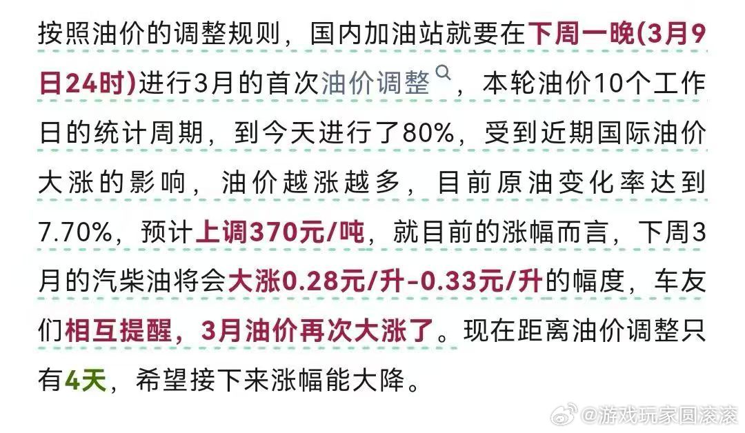 油价即将上涨按照油价的调整规则,国内加油站就要在下周一晚(3月9日24时)进行3月的首次油价调整,本轮油价10个工作日的统计周期,到今天进行了80%,受到近期国际油价大涨的影响,油价越涨越多,目前原油变化率达到7.70%,预计上调370元/吨,就目前的涨幅而言,下周3月的汽柴油将会大涨0.28元/升-0.33元/升的幅度,车友们相互提醒,3月油价再次大涨了。现在距离油价调整只有4天,希望接下来涨幅能大降。油价即将上涨