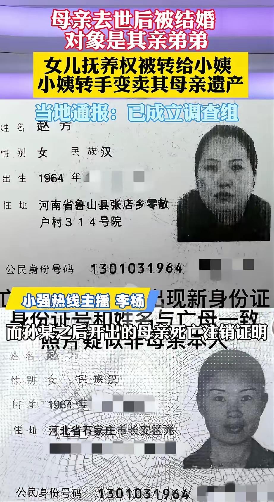 这是要吃绝户!河南平顶山,母亲去世后,9岁女儿的抚养权被转给小姨。10年后,女子得知母亲有房产和商户等,希望继承母亲遗产。谁知,办理手续时竟发现,母亲去世第二年,竟然被结婚,结婚对象是自己的亲舅舅,户口也没有被注销,变成了舅妈的脸。更可恶的是,母亲去世才14天,小姨就顺手变卖了母亲留下的房产。网友惊呼:这是真正的吃绝户呀! 说实话,这种事要不是亲眼看到档案,谁敢信?2018 年冬末春初的一个下午,19 岁的孙女士独自站在石家庄公证大厅的办事窗口前,将母亲赵芳的各项材料紧紧攥在手里,眼神里满是期待与不安。 她本以为这只是一次寻常的遗产继承办理,却没料到,冰冷的电脑屏幕上跳出的字眼,如同荒诞的恐怖片:系统显示,她的母亲在"去世"一年后,不仅再婚了,甚至还生育了其他子女。 那一刻,孙女士整个人都懵了。过去十年的生活,竟然是被至亲一手编织的弥天大谎! 这场精心策划的"吃绝户"大戏,要从2008年12月那场大雪说起。当时年仅9岁的孙女士,眼睁睁看着母亲赵芳因败血症在医院走到生命尽头。 可诡异的是,她连母亲最后一面都没守住,就被小姨赵某强行拽离了病房。紧接着发生的事更离谱——没让参加葬礼,没让见火化,连母亲埋在哪儿都不告诉。 小姨迅速搞出一份收养协议,直接切断了孙女士和生父的所有联系,把这个带着巨额遗产的孤女彻底控制在手里。 接下来的操作,快得让人头皮发麻。母亲赵芳离世仅仅 14 天,一份凭空伪造的委托书便仓促出炉,让人不寒而栗。 小姨找人冒充见证人签字,赶在尸骨未寒之际,把赵芳在石家庄名下的多处房产全部变卖。那笔原本属于9岁女孩的巨额房款,就这么直接流进了小姨的私人账户,连个水花都没溅起来。 但这帮人的胃口远不止于此。 为了在法律上彻底堵死孙女士的继承权,他们竟然给死去的赵芳安排了一场"再婚"! 2009年12月,也就是赵芳去世整整一年后,档案系统里出现了一份荒唐至极的再婚登记。在某些"关系"的运作下,赵芳的户籍照片被偷梁换柱成了大舅妈的脸。 原本在石家庄的户口被迁到平顶山还没注销。 更离谱的是,这份档案里显示,死去三年的赵芳"活"了过来,还和自己的亲哥哥——也就是孙女士的大舅——登记结婚了! 这种乱伦式的造假,目的再明显不过:通过制造"再婚"和"再生子女"的假象,直接稀释甚至剥夺孙女士作为唯一继承人的合法资格。 说白了,他们的目的很简单,就是要把这个无依无靠的孤女彻底排挤出去。 整整十年,孙女士在小姨所谓的"供学抚养"中长大,对那些被变卖的商铺、消失的珠宝以及被篡改的档案一无所知。 直到2018年那场失败的继承公证,这个家族最阴暗的角落才被彻底掀开。面对外甥女的质问,大舅妈竟然给出了一个荒唐的借口——这都是为了解决孙女士当年的上学问题。 开什么玩笑?哪有什么学籍政策,需要通过伪造死者婚姻、侵占孤女房产来实现的?这种鬼话连三岁小孩都骗不了! 就在今年3月,这桩尘封十年的旧案终于在网络上炸开了锅。舆论的怒火直接烧向了那张伪造的档案网。 引发全网关注的 “亡母嫁亲舅” 事件发酵后,平顶山鲁山县迅速发布通报,宣布正式组建联合调查组,针对身份冒用、遗产处置等核心问题展开全面调查,并承诺将依法处理相关责任方,及时公布调查结果。 站在2026年3月的节点回望,这不仅是一场关于金钱的劫掠,更是一次对法律底线的极限挑衅。刑法第280条关于伪造身份证件罪的红线就摆在那里,3至7年的刑期可不是闹着玩的。 那些打通档案局关系的"内鬼"、伪造签名的亲属、吞下不义之财的监护人,现在一个接一个地走进法律的审判序列。 这层层剥开的真相,让所有人看清了当贪婪压倒血缘时,人性能扭曲到什么地步。 对孙女士来说,这场迟到了近二十年的清算,不仅是为了讨回那些被变卖的房产,更是为了在被篡改的档案里,找回母亲真实存在过的证据。 正义或许会因为人为的阴谋而绕路,但当潮水退去,那些试图"吃绝户"的人,终究要原封不动地吐出所有带血的利益,并为那十年的欺瞒付出对等的代价! 信息来源:《母亲去世一年后竟与亲舅舅结婚? 还被亲小姨卖了房子? 遗产被转移殆尽女儿无法继承,“跑断腿开不出妈妈的死亡证明”,河南鲁山: 成立调查组全面调查》青岛新闻网