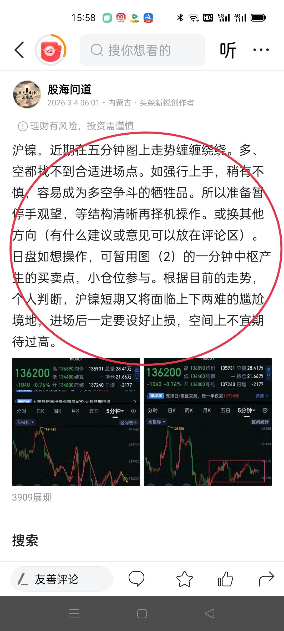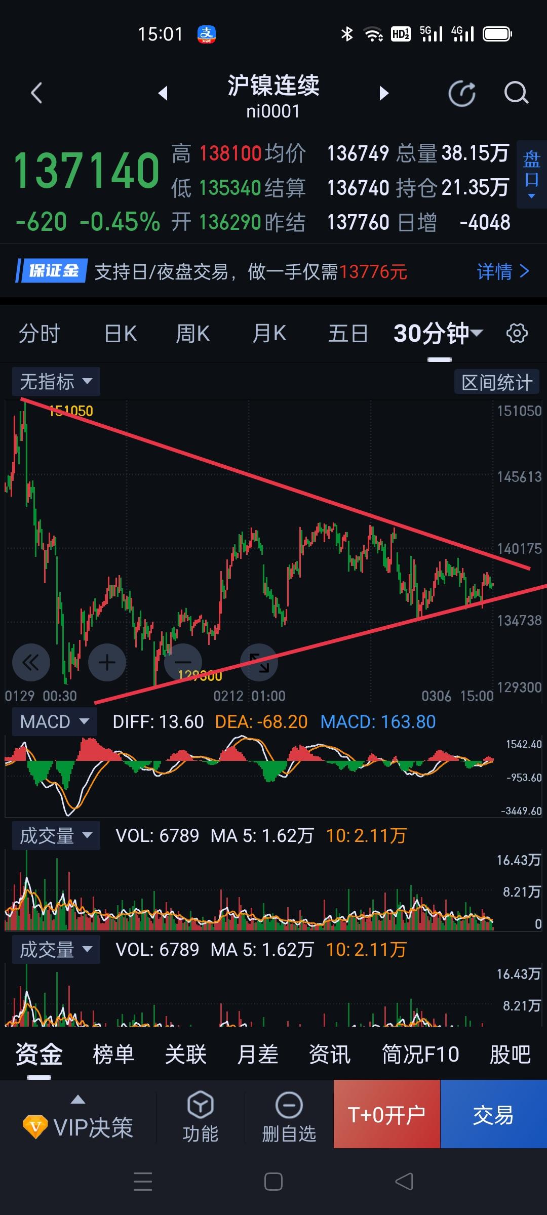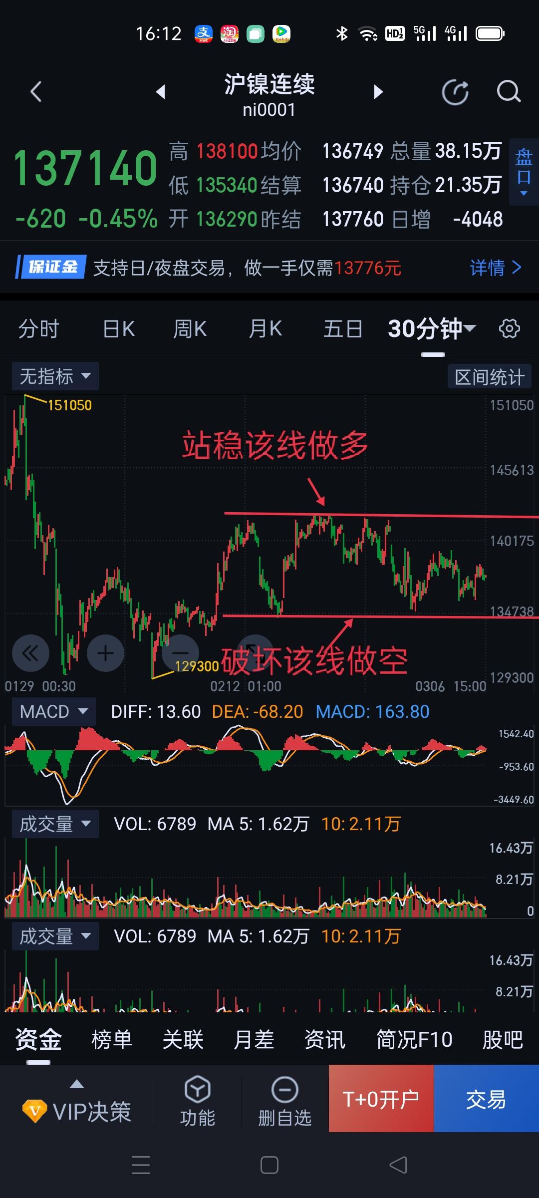 沪镍,目前形态,依然处于上下两难的尴尬境地。如此走势背后是镍矿政策还有什么变数?也无需揣度。普通投资者无法引导走势,也无需根据臆想打出提前量,只需清晰识别走势,当多则多,该空则空。最近感慨颇多,有人怪操作过于保守。因本周只在周三有过多单的操作,其余时间均处于观望中。今天身边朋友有个别抢跑,曾因打出提前量获利颇丰,但这次没有被幸运之神光顾,其结果铩羽而归。投资中,严格的纪律执行,是长期稳定盈利的保障。投资不推崇"敢为天下先"。很多时候耐住寂寞,才能守住繁华。 进入正题,沪镍日盘依然保持收敛震荡的走势(关于目前的走势,周三一早的文章有过阐述)。现在结构就像螺蛳壳里做道场,相当考验技术能力。只有形成图(3)的结构后,或上、或下才能打开新的空间。夜盘如想入手"空单"还是观察135280的得失,再择机入场。如想做多,起码要看到137200有效站稳再入手。