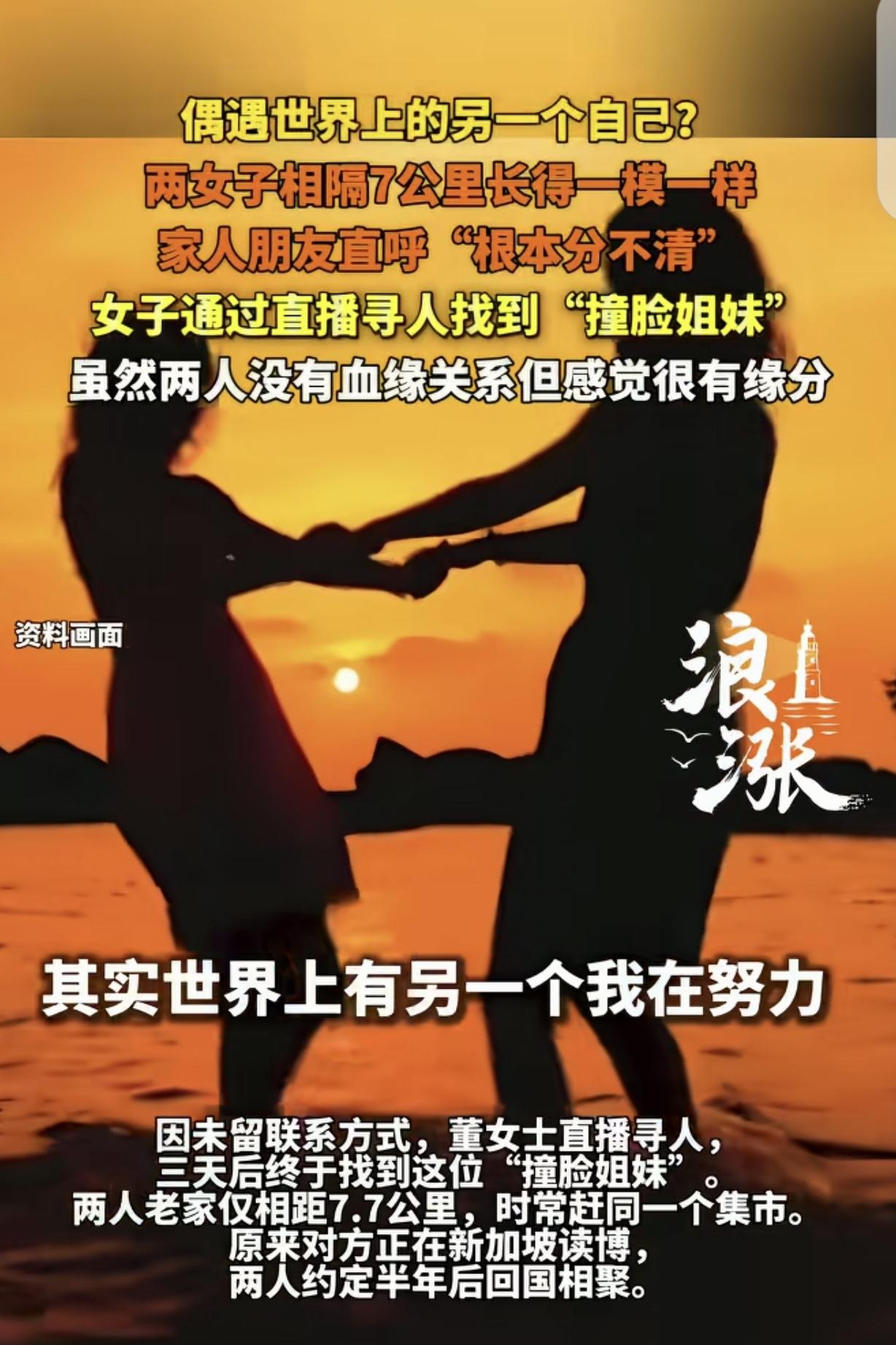 “太不可思议了!”河南洛阳,一女子在路边,竟看到一个跟自己长的一模一样的人,不管是五官眉眼,举止神态,就像“复制黏贴”一样,就像世界上的另一个“自己”,而她不是双胞胎,因为当时都懵圈了,没留下对方联系方式,等女子反应过来,就在网上寻找这个女子,3天后,她真找到了这个“撞脸姐妹”,才发现她们老家只相隔7.7公里,还经常赶同一个集市,对方很优秀,在新加坡读博士,2人约定半年后回国相聚。网友:最明白的还是你老爸,先查一下谁家老公出轨! 一天,董女士忙完工作往家走,刚走到公交站台,她一抬头吃了一惊,顿时瞠目结舌,不敢相信自己的眼睛。 只见,一个女孩正踮脚看站牌,她的五官,举止,神态和自己如出一辙。 董女士忍不住凑过去几步,隔着人群偷偷打量。那人的眉眼简直跟镜子里的自己一模一样,就像自己在照镜子,两人除了衣服和发型不一样,其他就是一个模子刻出来的。 董女士脑子里一片空白,攥着挎包的手指越捏越紧,直到对方上了公交车,她才反应过来忘了问联系方式。 董女士风风火火回了家,饭也顾不上做,扒拉着手机刷同城论坛,把遇见“另一个自己”的细节写了满满一篇。 她翻出自己的自拍配上文字,拜托朋友帮忙转发。 接下来的3天里,董女士只要醒着就刷新帖子,她觉得太不可思议了,自己没有双胞胎姐妹,她竟然在人海里,发现了一个和自己撞脸的人。 3天后,董女士终于和这个有一面之缘的女子联系上了,对方发了一张自拍,董女士盯着屏幕看了足足5分钟,确认这就是公交站遇见的女孩。 两人聊了才知道,她们老家只隔了不到7.7公里,每年春节都会去同一个集市逛庙会。 女子很优秀,正在新加坡读博士,跟董女士温和内敛的性子不太一样,却有种莫名的亲切感。 董女士把女孩的照片拿给爸妈看,老两口眯着眼看了半天,最后连连摆手说分不清。 亲戚朋友也说两人实在太像了,啥啥分不清,董女士和女子约定,半年后女孩回国就见面。 董女士说:世界上有另一个“我”在努力,在发光,在好好的生活,对我来说这就是最圆满的结局了。 董女士的经历像极了现实版的平行世界奇遇,让人忍不住感叹缘分的奇妙。 有人拿出轨开玩笑,其实大可不必。撞脸本就是极小概率的事,何况两人老家挨得近,说不定祖上还是远亲。 更值得关注的是,这件事戳中了不少人心里的“另一种人生”遐想。 董女士是温和内敛的普通上班族,对方是远在新加坡的女博士,看似截然不同的人生,却因为一张相似的脸紧紧联系在一起。 这让董女士看到了自己或许可能拥有的另一种生活,也让我们每个人都忍不住畅想,如果当初做了不同的选择,会不会有另一个自己过着完全不一样的人生? 那些说“分不清”的亲戚朋友,反应最真实。 毕竟相似到连亲人都认不出,这种冲击力可想而知。这也提醒我们,科技发展到今天,人脸识别已经广泛应用,可这种极端撞脸案例,也给身份识别提出了新的挑战。 《民法典》第990条规定,人格权是民事主体享有的生命权、身体权、健康权、姓名权、名称权、肖像权、名誉权、荣誉权、隐私权等权利。 此案例中,双方均对自己的肖像享有权利,可正常使用自身肖像,一方如果未经对方允许使用另一方肖像谋利则构成侵权。 因二人撞脸属自然巧合,互相使用自身肖像不涉及侵权。 对此,你怎么看?