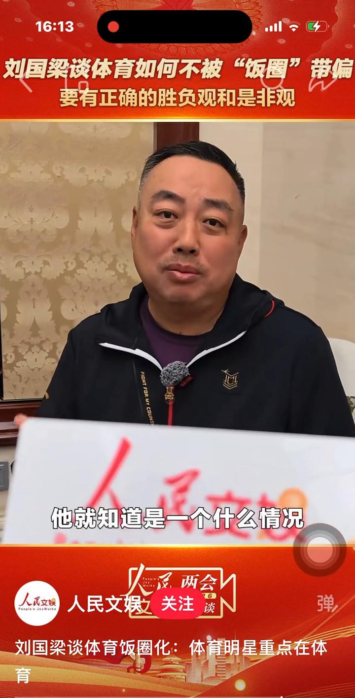 刘国梁谈体育如何不被"饭圈"带偏,要有正确的胜负观和是非观。 人民文娱关注。 他们是体育明星,因为球打得好,所以在球场上不仅仅是只会赢球,更要学习面对困难和输球之后怎么坦然自然的接受,能够不断地磨练修炼自己,让自己更加强大,所以这才是根本。 让那些所谓的畸形"饭圈"是没有受到过这样的体育,自身不参与,所以完全是不懂的。真正的里边是因为理解了,了解了,喜欢才会更深入。所以青少年自己多参与运动,多打球,就知道打球有多难,打球当中的快乐。 经常参加一些比赛,面对输赢的时候就有正确的胜负观,有正确的生活观,就有正确的是非观,就知道是一个什么情况。所以我觉得这个还是非常重要的,让孩子们身心健康地培养下一代,就是让他们自己亲身去经受体验感悟。 刘国梁是有体育两个字。