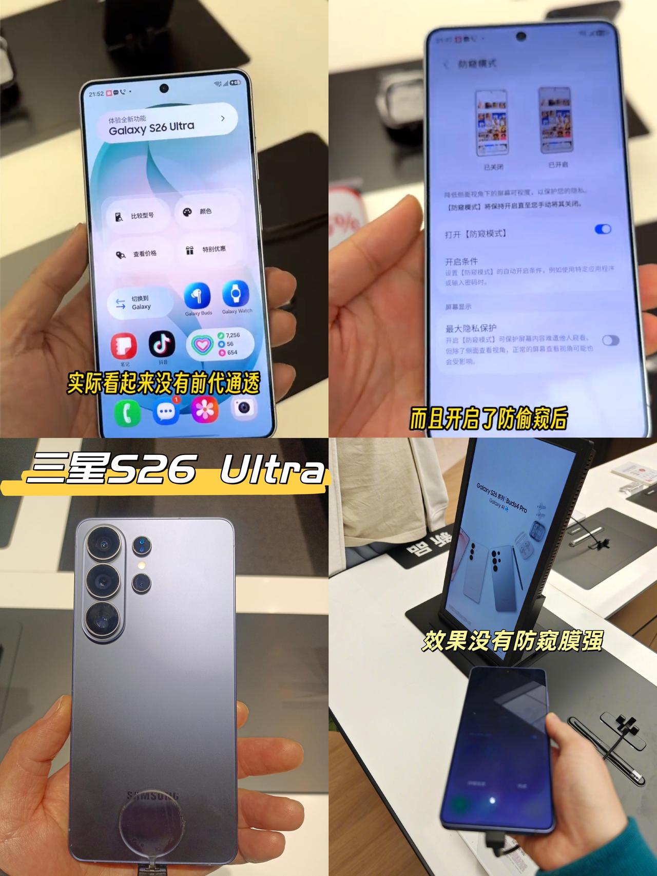 感觉三星这个防窥模式不咋好用啊😓 今天有空去摸了一下三星S26ultra 屏幕比上一代确实差不少啊... 就算不开防窥模式素质依然一般 亮度和通透度明显不如三星S25 Ultra 感觉蒙了一层很薄很薄的黑纱 肉眼可见的差距😓 而且开了防窥模式后 屏幕防窥效果也很一般般啊 没有专门的防窥膜强🤔 不过扬声器🔉不错 试听了一下播放歌曲铃声啥的,调音是🆗的 总体来说,三星S26ultra价格虚高了 等跳水吧,反正三星头三个月价格猛跳是常态