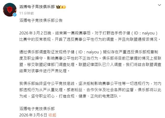 369还是草率了...今日滔搏电子竞技俱乐部发布公告:第一赛段赛事结束后,打野选手杨子健(ID:naiyou)比赛中的反常表现,违反赛事公平性行为的调查,并且向联盟通报该情况。