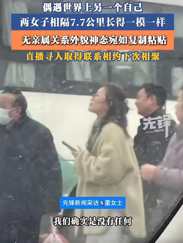 这下彻底解释不清了!河南洛阳,女子和外甥女开车出门,突然发现车外一名女子和她长得几乎一模一样,要不是人就坐在车里,外甥女差点就认错人了,事后女子努力找到对方,得知双方家的距离相隔7公里,但两人却没有任何交集,更不要说血缘关系,这让她也觉得很神奇。 车外那名女子,眉眼、脸型乃至神态,都和董女士如出一辙,连身上的浅色外套都撞了款,若非自己坐在车里,她都要以为是镜中倒影。 红灯转绿车辆驶离后,董女士频频回头满是疑惑,回家翻遍行车记录仪,只拍到模糊身影,毫无有效线索。 不甘心的她开直播求助,又在本地社群发布消息,附上行车记录仪影像,请大家留意这位“复刻版”的自己。 从遗传学界研究来看,无血缘却高度撞脸的现象并非玄学,人类面部特征由特定基因调控,同种族内基因序列存在重合概率,便会催生相似面孔。 类似的巧合并非孤例,此前成都一对情侣因长相酷似被误认成兄妹,DNA鉴定后确认无血缘关联,也曾引发全网热议。 三天后,对方朋友刷到直播牵线成功,视频里两人笑起来的弧度、眼角细纹都惊人相似,交流后发现老家仅隔7.7公里。 这场跨越多年的擦肩而过,最终因一张相似的脸相连,让两个毫无交集的人成为彼此生命里的特别存在。 这种巧合不仅是基因排列的偶然,更像是生活埋下的温柔彩蛋,提醒着我们世界的广阔与未知。 有网友调侃“自己撞自己,连外套都同款,怕不是厂家打广告的!”也有人打趣建议两人赶紧做亲子鉴定。 从街头偶遇的震惊,到全网寻找的忐忑,再到成功连线的惊喜,董女士的这段经历像一出充满戏剧性的生活短剧,可这样的无血缘撞脸,除了基因巧合和缘分,还能有什么更有意思的解读呢? 在我看来,不管是基因里藏着的小秘密,还是命运安排的小惊喜,这场相遇都足够温暖,原本平行的人生因一张相似的脸交织,说不定未来还能成为彼此最特别的闺蜜,想想都觉得暖心又奇妙。 这事你怎么看?