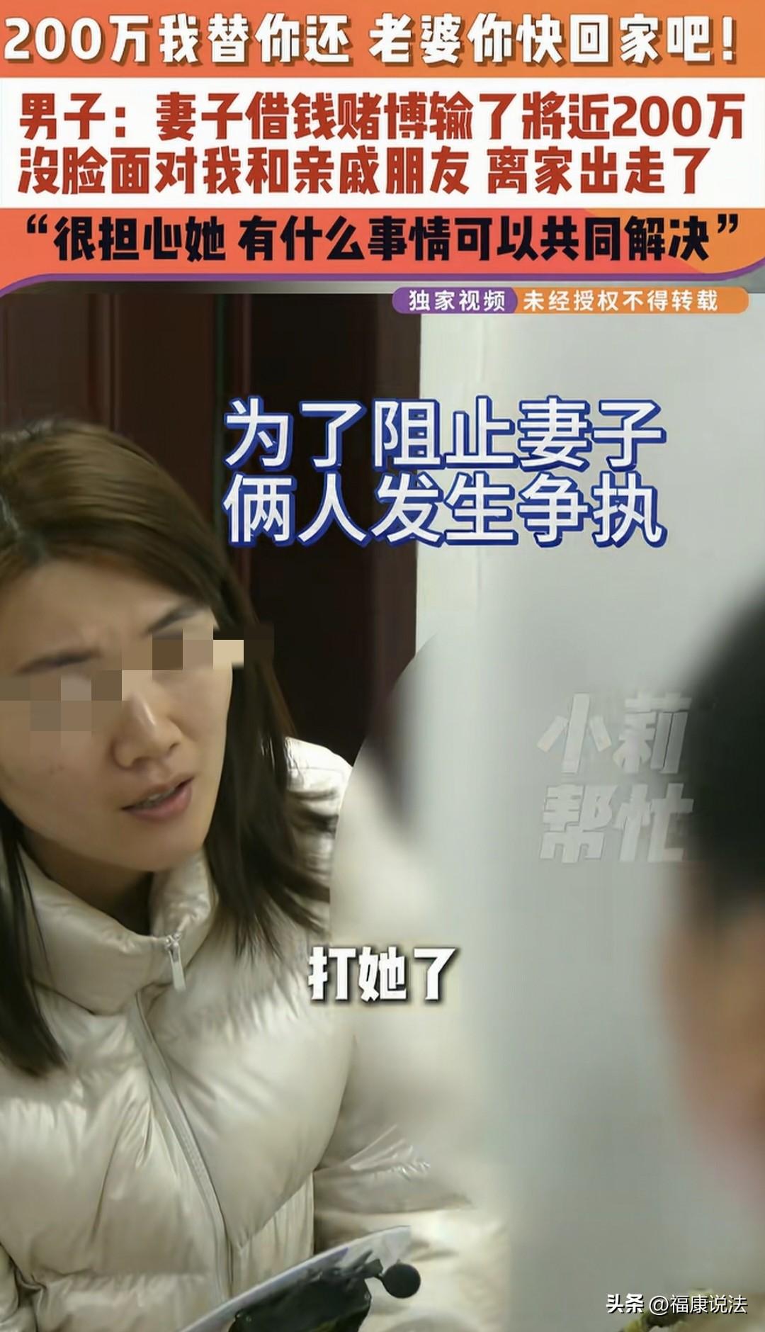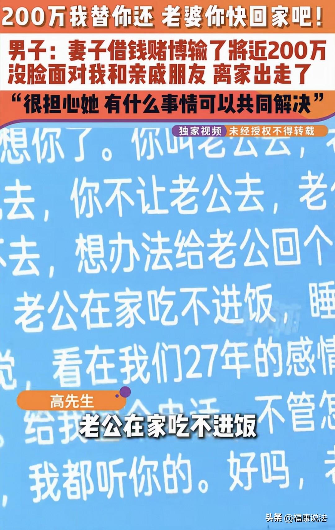 “太败家了!”河南焦作,女子借钱赌博,一晚上输了100多万,加上之前赌债将近200万,丈夫气急打了她一顿,谁料,女子突然离家出走,丈夫后悔喊话:老婆你快回来,欠下的200万我替你还,网友:可怜之人必有可恨之处。 据小莉帮忙3月5日报道,高先生焦急地喊话,盼着离家出走的妻子能早日归来,他信誓旦旦地说:“欠下的200万,我替你还!” 高先生和妻子携手走过了27个春秋,这么多年来,夫妻二人相濡以沫,日子过得和和美美,孩子也乖巧懂事,一家人的生活温馨又幸福。 然而,平静的生活在三四年前起了波澜。那时,妻子开始频繁与朋友一起出去玩,起初不过是寻常娱乐,可渐渐地,娱乐变了味,竟发展成了变相赌 博。 起初,高先生并未过多在意,他觉得妻子不过是偶尔出去放松放松,便没有过多干涉。 可赌 博就像个无底洞,一旦沾染,便难以自拔。妻子越陷越深,赌瘾越来越大,到了2025年,情况愈发失控。 一个晚上,妻子竟输掉了100多万,加上之前零零散散的赌债,累计竟将近200万。 高先生得知这个消息后,犹如五雷轰顶,怒不可遏。他怎么也没想到,妻子竟会借钱赌 博,短短时间内就输掉这么多钱,这简直就是把家往火坑里推啊! 在盛怒之下,高先生失去了理智,他用辣椒水喷向妻子,还抢过手机,动手打了她…… 那一晚,妻子悔恨交加,她觉得自己没脸再回家,也无颜面对亲戚朋友,尤其是深爱自己的丈夫高先生。 还没等高先生消气,妻子便突然离家出走了。 这突如其来的变故,让高先生瞬间崩溃。妻子欠下的巨额外债让他忧心不已,可此刻,他更担心的是妻子的安危,生怕她在外有个三长两短。 他焦急地给妻子发信息:“在外一定保重身体,老公想你了,老公在家吃不下饭,睡不着觉……想法给老公回个电话,我再三请求,我不再打你了。” 高先生坦言,自己实在放不下妻子,也舍不得这段27年的感情,更何况还有孩子。 无论妻子在外面欠下多少钱,只要她愿意回来,自己都愿意独自承担。 他对着镜头,目光坚定地喊话:“你也知道我有能力,欠的债,我替你还!” 有人说,真应了那句话:好汉没好妻,好妻没好汉! 27年的感情,哪能说断就断,孩子也在中间,高先生肯定舍不得妻子。 妻子欠下巨债,换谁都得生气,高先生动手虽不对,但也是气急了。 妻子离家出走,高先生不愁债先愁人,说明他重情重义。 他愿意替妻子还债,不是因为傻,而是放不下这么多年的感情。可妻子也得反思,赌 博害人不浅,差点毁了这个家。 从法律方面讲,高先生可以不还妻子欠下的赌债。 《民法典》第1064条规定:夫妻一方在婚姻关系存续期间以个人名义超出家庭日常生活需要所负的债务,不属于夫妻共同债务。 简单说,要是夫妻一方借钱用于家庭正常生活开销,像买吃的、孩子上学这些,那就是共同债务,两人都得还。 但要是像高先生妻子这样,借钱去赌博,这明显不是为了家庭生活,而且金额巨大,正常情况下就不算共同债务,高先生没义务替她还。 不过高先生出于感情,愿意承担,这是他个人选择。 有人感叹,太败家了,多少个家庭干一辈子也攒不下200万。 这不就是相当于把债务留给家人,自己跑了吗? 最后,希望妻子能看到高先生的真心,早点回家。 一家人齐心协力,哪怕日子苦点,也能慢慢把债还上。 也提醒大家,赌 博碰不得,别为了一时刺激,把幸福家庭搭进去。