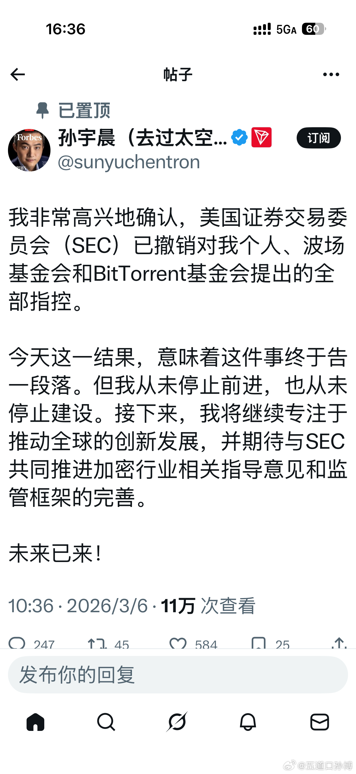 孙宇晨我孙割在推上兴奋的声称,美国证券交易委员会已经撤销了对他的指控。