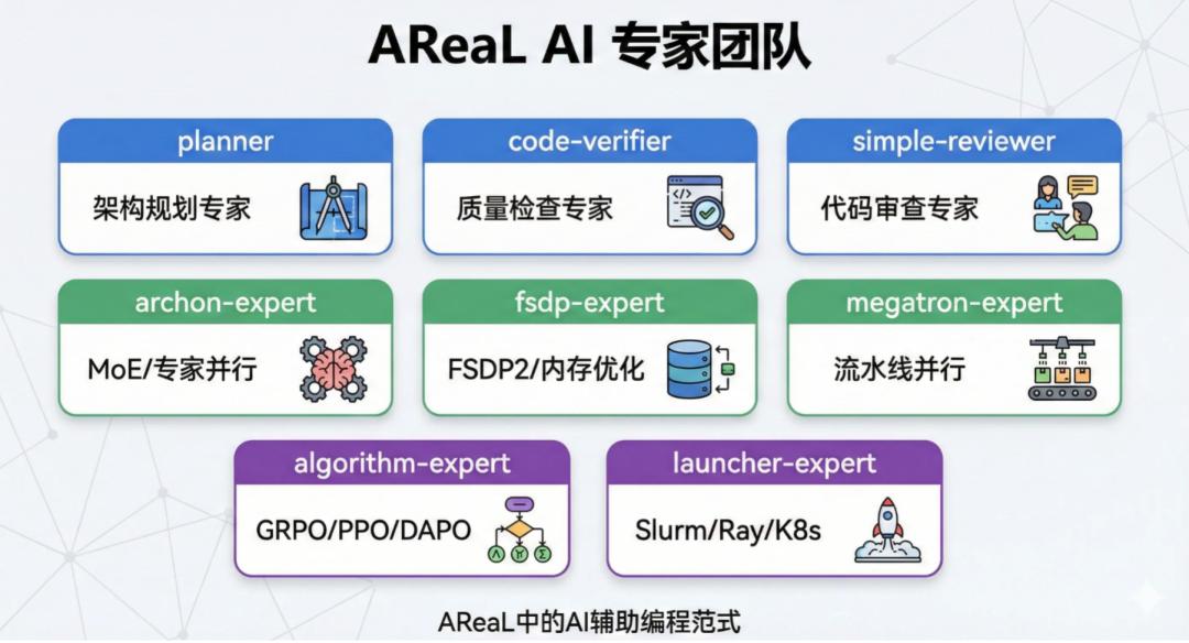 创造这一效率奇迹的秘诀在于 AReaL 集成的一整套 AI 辅助开发体系,实现了复杂工程开发的高度自动化。 AReaL v1.0 引入的 AI 辅助开发流程,为开发者提供了从规划、编码、校验到 PR 创建的全链路支持。尤其是在处理 MoE 并行、内存优化、算法实现等核心模块时,专属的 AI 编程助手会像一位资深专家,在代码变更时及时出现并提供针对性指导,为每一次代码变更保驾护航,有效降低了开发和维护的门槛。AReaL 的 AI 辅助编程不只是提效工具,更能在复杂基础设施工程中承担“可交付”的研发工作,引领了下一代 AI 基础设施工程范式的革新。