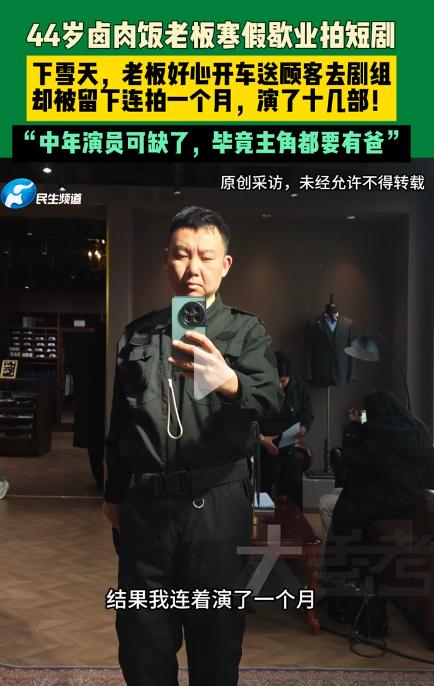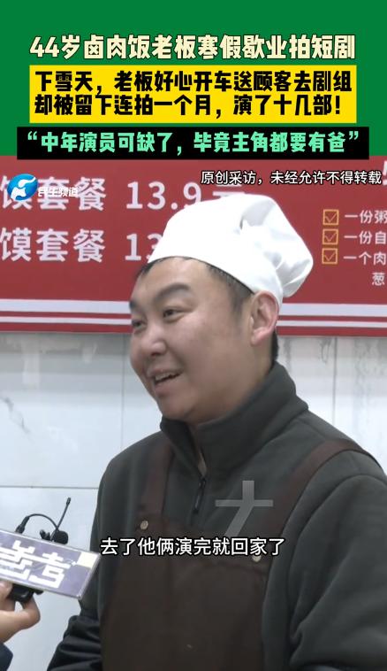 火了!郑州44岁卤肉饭老板,寒假歇业送顾客,竟被剧组留拍1个月,演了十几部 3月4日,河南郑州北大学城附近,44岁的卤肉饭老板结束了为期一个月的特殊体验,重新回到自己的小店,开启了正常的经营。 谁也没想到,这个平日里围着灶台转、专心卖卤肉饭的老板,寒假歇业期间,竟意外解锁了“群演”新身份,一口气参演了十几部短剧,成了周边小有名气的“中年群演”。 这场意外的跨界,没有刻意的谋划,全源于一场下雪天的好心之举。老板在北大学城附近经营卤肉饭小店已有一年多, 客源大多是周边的大学生,平日里为人热情,待人真诚,小店也积累了上千名回头客,生意十分红火,偶尔忙不过来时,还会招学生兼职帮忙。 今年寒假,学生们陆续放假回家,卤肉店的生意也淡了下来,老板索性决定歇业一段时间,给自己放个假,好好放松一下。 就在歇业后的几天,郑州下起了大雪,路面湿滑,出行十分不便,不少车辆都被困在路边,打车更是难上加难。 当天,两名常来店里吃饭的大学生顾客,匆匆来到卤肉店门口,神色焦急,四处张望,似乎在寻找车辆。老板见状,主动上前询问,得知两人要去剧组当群演,因大雪打不到车,眼看就要迟到,十分着急。 看着两个学生焦急的模样,加上自己当天正好没事,老板便主动提出,开车送两人去剧组。一路上,雪越下越大,路面十分湿滑,老板小心翼翼地驾驶,避开积雪路段,最终准时将两名学生送到了剧组所在地,没有耽误他们的拍摄。 原本只是一次顺手的好心帮忙,老板送完学生后就准备转身离开,却被剧组的工作人员一眼看中。 工作人员上下打量着他,发现他的形象十分贴合剧中中年角色的设定,加上气质沉稳,便主动挽留,希望他能留下来参与短剧拍摄,尝试一下群演的工作。 老板一开始有些犹豫,他从未接触过演艺相关的工作,也没有任何表演经验,担心自己无法胜任。但架不住工作人员的热情邀请,加上自己正好歇业,也想体验一下不一样的生活,便答应了下来,没想到这一留,就是整整一个月。 进入剧组后,老板才发现,自己的形象在短剧行业十分吃香。如今郑州短剧行业发展迅速,剧组通告不断,但中年演员的缺口却很大,很多短剧的主角都需要搭配中年演员饰演家长角色,而他的外形和气质,恰好契合这类角色的需求。 这一个月里,老板彻底投入到短剧拍摄中,每天跟着剧组早出晚归,虽然辛苦,却也充满乐趣。他没有经过专业的表演培训,就凭着自己的真诚和认真,慢慢摸索表演技巧,从一开始的生疏拘谨,慢慢变得熟练自然,甚至能快速适应不同角色的需求。 短短一个月时间,他先后参演了十几部短剧,大多饰演主角的父亲角色,虽然戏份不多,却每一个都演绎得十分到位,得到了剧组工作人员的一致认可。 拍摄期间,他也慢慢了解到,短剧行业中,中年演员的需求一直很大,尤其是形象贴合、态度认真的中年群演,更是供不应求。 拍摄间隙,老板也会和剧组的工作人员交流,了解短剧拍摄的相关知识,也认识了许多志同道合的人。 他发现,群演行业虽然辛苦,但也有可观的收益,普通群演有固定时薪,若是有特写镜头,收入还会更高,不过行业也存在信息杂乱、薪资结算不及时等问题。 随着寒假结束,学生们陆续返校,卤肉店也到了重新营业的时间,老板便结束了自己的群演之旅,回到了自己的小店。 这段特殊的经历,让他收获满满,不仅体验了不一样的生活,还积累了许多有趣的回忆,也摸清了短剧行业的一些门道。 老板表示,自己的主业依然是卖卤肉饭,拍短剧只是一次偶然的体验,未来也会继续保持这份热情,兼顾好小店和自己的兴趣。 对此,你们有什么看法,欢迎评论留言~