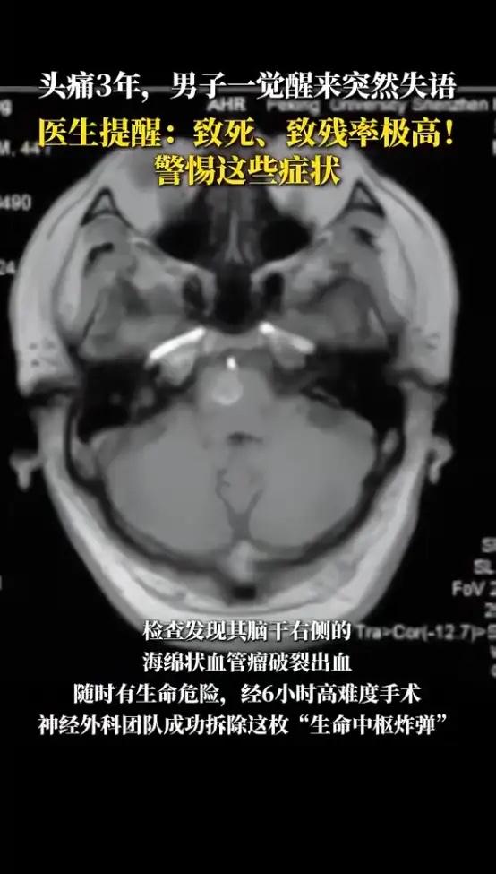 “悲剧还是发生了!”近日,广东深圳,一男子反复头痛三年,以为是工作劳累,每次都硬扛过去,直到某天清晨醒来,男子感觉到剧烈头痛,说话也变得含糊不清,家人将他紧急送往医院,最后被确诊为海绵状血管瘤并出血!网友:这下后悔了! 这位44岁的深圳男子叫阿伟,三年来,头痛时不时就来拜访一下。他以为是加班太多、压力太大,喝点热水,睡一觉就能扛过去。身边很多人都这样,头疼脑热,忍忍就过去了。这个“忍”字,让他错过了身体发出的最早警报。 直到一个清晨,一阵撕裂般的剧痛把他从睡梦中拽醒,他想喊家人,却发现舌头不听使唤,话都说不清楚。左边的手脚也使不上劲,整个人瘫在床上。家人吓坏了,赶紧把他送到医院。检查结果发现他的脑干桥脑右侧,长了一个海绵状血管瘤,而且已经破裂出血。 脑干那是人体的生命中枢,只有拇指大小,却掌管着呼吸、心跳、血压。这里出血,随时可能致命。医生立刻组织了紧急手术。手术持续了六个小时,最终成功清除了这个“炸弹”。术后,他的语言和肢体功能慢慢恢复了,但这场惊吓,足以改变他对健康的全部认知。 他得的这个“海绵状血管瘤”,名字里带“瘤”,其实不是癌症,而是一团异常生长的血管。它就像大脑里一个结构不结实的小血窦,壁很薄,容易渗血或破裂。很多人脑子里有这东西,但自己完全不知道,因为它可能一辈子安安静静。可一旦它“闹脾气”,症状就来了,最常见的就是反复发作的头痛、头晕,严重的会引发癫痫、肢体麻木无力。 它的早期症状太普通了,头痛、头晕,谁没经历过?很多人第一反应就是没睡好、太累了、颈椎病。正是这种“想当然”,让隐患悄悄长大。血管瘤反复微量出血,刺激周围组织,某一次出血量大了,就可能造成像这位深圳男子一样的急性发作,留下永久性的神经损伤,甚至危及生命。 现代人生活节奏快,有点小毛病总想着扛一扛,却不知道有些病,根本扛不过去。身体发出的信号,再小也不能忽视。尤其是反复、固定部位、逐渐加重的头痛,一定要及时检查。一次头部CT或核磁,可能就能救你一命。别拿健康赌运气。你的身体,比你想象得更需要被认真对待。 各位读者你们怎么看?欢迎在评论区讨论。