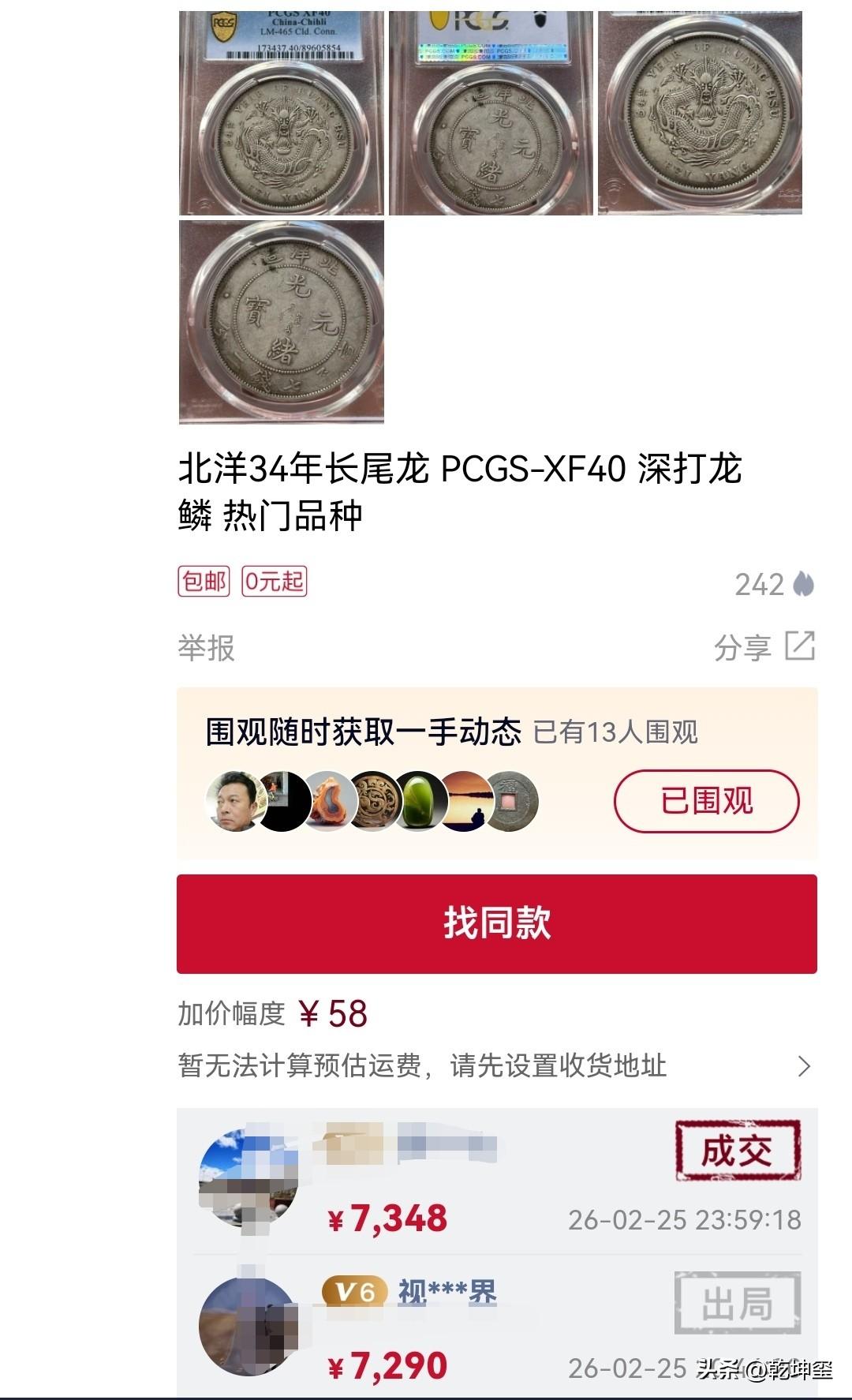 一枚北洋龙拍了这么多钱? 2月26日截拍的一枚北洋龙34年,拍了7348元人民币。 这枚银元有PCGS评级公司评级,给了个有效分,XF40分,众所周知,美评出分很难,只要出分,价值就翻倍,按目前价格,拍了七千多元,已经不算低了,可是,比起高峰期,还是差了那么点事儿?大家认为这个价格合适吗?这枚银币价值如何 未来两年银元收藏走势如何 龙银币价格 晚清民国银元 复刻军阀银元
