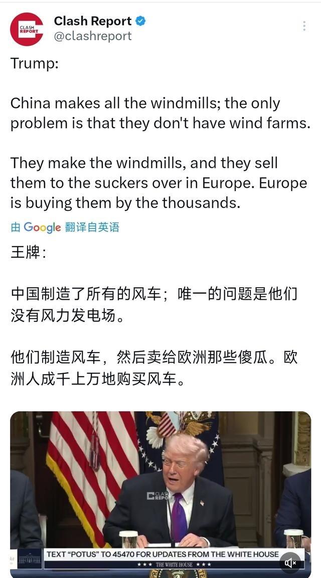 特朗普北京时间3月5日接受采访时表示:“中国制造了所有的风车;唯一的问题是他们没有风力发电场。他们制造风车,然后卖给欧洲那些傻瓜。欧洲人成千上万地购买风车。” 特朗普在北京时间3月5日的采访中直接点名中国风电,说中国生产了全球几乎全部风力涡轮机,本国却没建多少发电场,而是把设备甩给欧洲买家,还把那些欧洲国家叫成傻瓜。这话传开后,立刻引发多方核查和回应,因为实际情况与中国风电的真实规模差得太远。 中国风电产业链完整,从零部件到整机组装,再到大规模部署,都已形成全球领先优势。多家中国企业占据世界风电机组制造商排行前列,前几名基本是中国品牌。这些公司一方面满足国内需求,一方面出口到欧洲和其他地区。欧洲采购中国涡轮机,主要看中性价比高、供应链稳、技术成熟,这是市场选择的结果。 国家能源局数据显示,截至2025年底,中国风电累计装机容量达到6.4亿千瓦,同比增长22.9%,连续多年保持全球第一,占全球总装机近一半。这个容量规模远超其他国家总和,相当于多个大型传统能源项目的叠加。从“三北”地区到东南沿海,从陆上戈壁到近海海域,风电项目遍布全国。甘肃酒泉风电基地就是典型代表,作为全球最大 onshore 风电综合体之一,安装数千台机组,规划容量超过20吉瓦,从卫星上看布局密集、占地广阔。 海上风电同样强劲。中国海上风电累计装机和新增装机连续多年领跑全球。广东等地深海项目采用适应复杂海况的技术,单场容量达数吉瓦,通过海缆接入电网,为沿海地区提供可靠电力。这些项目不是摆设,而是实打实投运的发电设施。 2025年全国风电新增装机1.2亿千瓦,同比增长51%,其中陆上新增1.1亿千瓦,海上新增659万千瓦。发电量方面,2025年风电发电量达到1.13万亿千瓦时,同比增长13%,平均利用率94%。这些数字直接证明中国本土有海量运行中的风电场,而非特朗普所说只出口不自用。中国风电发电量占全球四成左右,是美国两倍以上,一年发的电比美国两年还多。 特朗普声称找不到中国风电场,甚至说那些建的也不转不发电。但公开卫星图像、官方统计和国际报告都显示甘肃、新疆、内蒙古等地大型基地清晰可见。西方媒体如英国《卫报》、BBC和Euronews等多次报道这些项目,强调中国风电规模和技术领先。多家能源机构数据一致,中国风电市场份额占全球七成以上。 中国产能充足,在满足国内电力增长基础上实现出口,支持其他国家能源结构优化。欧洲国家买中国设备,是因为产品可靠、成本低、交付快,而非盲目跟风。中国风电出口助力全球减碳,减少大量碳排放,这是国际公认的事实。特朗普的表述忽略这些客观数据,在国际场合反复出现类似观点,却被事实反复打脸。