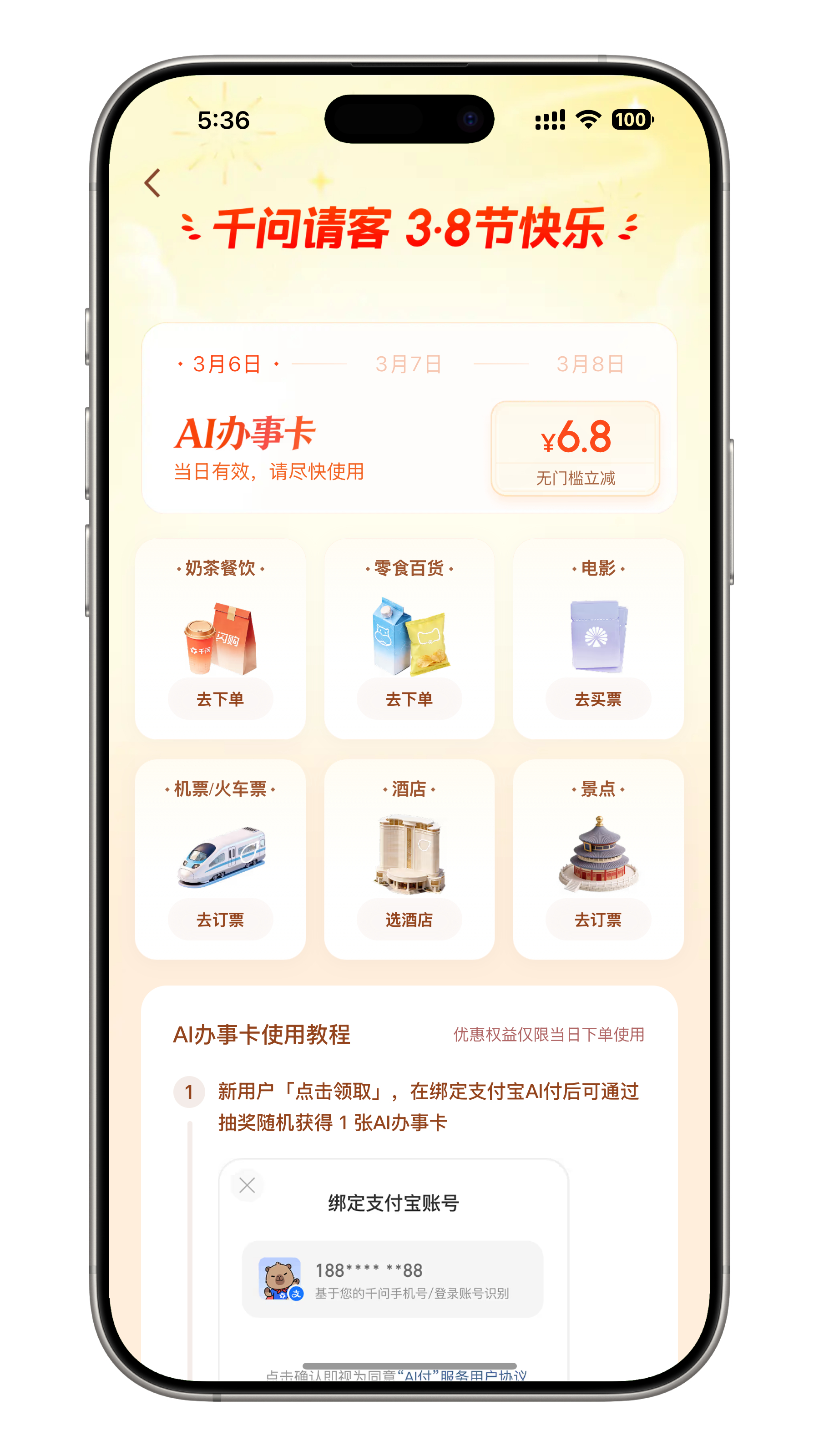 千问妇女节活动千问刚发完免单卡,这次3.8妇女节也来活动了!我抽了6.8大家快去抽 千问宣布妇女节再次请客