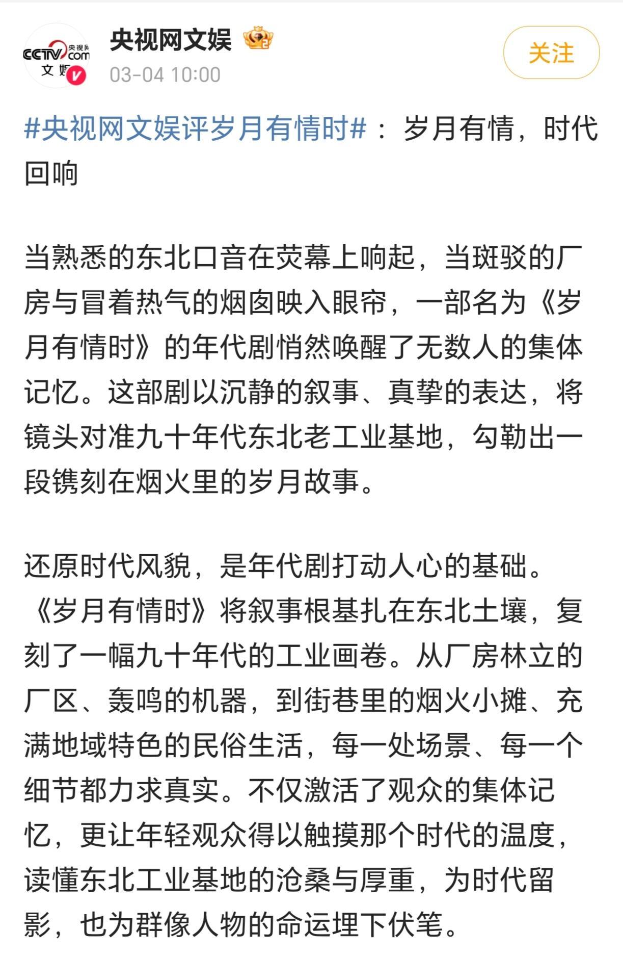 同时被央妈和新华社选中的年代剧 刚追完《岁月有情时》,终于明白为啥央妈和新华社都爱它了!地道东北话、破旧的厂房,黄景瑜他们把普通人的起落拍的太感人了,不管走多远,家都是能让人安心睡个好觉的地方,太好哭太好嗑了!电视剧岁月有情时