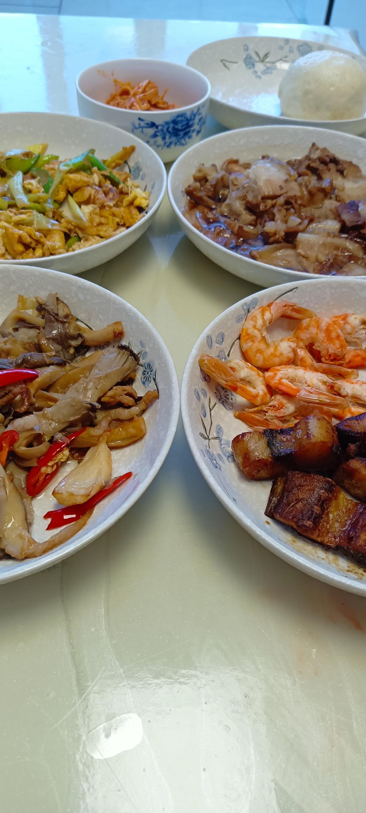 我认为我是个很会安排生活的女人,努力经营家庭,努力做好每一顿饭。 我到啥时候就做啥,腊八蒜、韭菜花、辣椒酱、腌酸菜和芥菜疙瘩、腌咸肉、晒咸鱼、包粽子、包豆包,这些东西,我每年都做,其实我也吃不多少,就是有烟火气,也为了让他吃个新鲜。 有好友问我,他到底有啥过人之处?就像缺祖宗似的伺候他? 他也没啥特别,我就是自从成家那一天起,就这么过日子,已经养成习惯了!我的第一次婚姻,也是这么过来的。不论好习惯坏习惯,都不容易改正。 最近由于我和老公我俩闹矛盾了,好几天了,我早餐没包饺子,晚餐也不让他点餐了,我自己说了算,想做啥我就做啥。 前两天他还不适应,那天还说京酱肉丝做的挺好吃,但不是他今天想吃的菜,是不是够了难伺候? 这两天逐渐的适应了,他也不挑了。 其实我做饭从来不糊弄,不用他点菜,我也会好好做饭,努力做好每一餐。 就没有一顿饭是将就的,包括我在孩子家做饭也一样,亲家母夸我做啥都好吃! 也有弊端,亲家母做饭,女儿女婿都不爱吃。 所以不管在家里还是在女儿家,我都是主厨。 有时候心里也不舒服,我现在还不老,我有挣钱的能力,我还能大显身手,可就硬生生的把自己按在灶台边,围着锅碗瓢盆绕! 心不甘,但是为了给女儿双倍的爱,为了托举女儿,有再多苦,我也得咽下! 我女儿说过,授人以鱼不如授人以渔!她有稳定的工作,也是我最大的愿望! 也有人劝我,让孩子家雇保姆,多给她点钱就行了呗!自己带孩子放心,当奶奶姥姥的,是发自内心的疼爱,保姆是为了挣钱,性质是不一样的! 扯远了,晒晒今天的晚餐吧!不用点菜,我也会换样做,一星期也不会重样的。 蒸肉不是新做的,第一个菜是自己做的咸鱼干,挺好吃的,我再做的时候出个教程。
