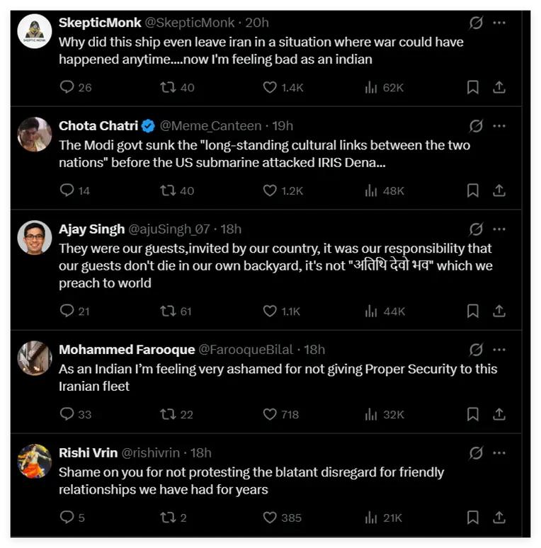 大仙的尿性,暴露无遗!——3月4日,美军核潜艇在靠近斯里兰卡的国际海域突然对由印度归国途中的伊朗军舰“德纳”号发动袭击,导致该舰被击沉,舰上至少87人丧生。这艘伊朗遇袭的“德纳”号军舰,是受印方邀请在印度参加完两场印方举办的海军活动后返航回国:一场是代号“米兰”的多国海军联合演习和联欢活动,另一场则是2026印度国际阅舰式活动。 美军杀害了印度的客人,而大仙罕见保持了沉默!