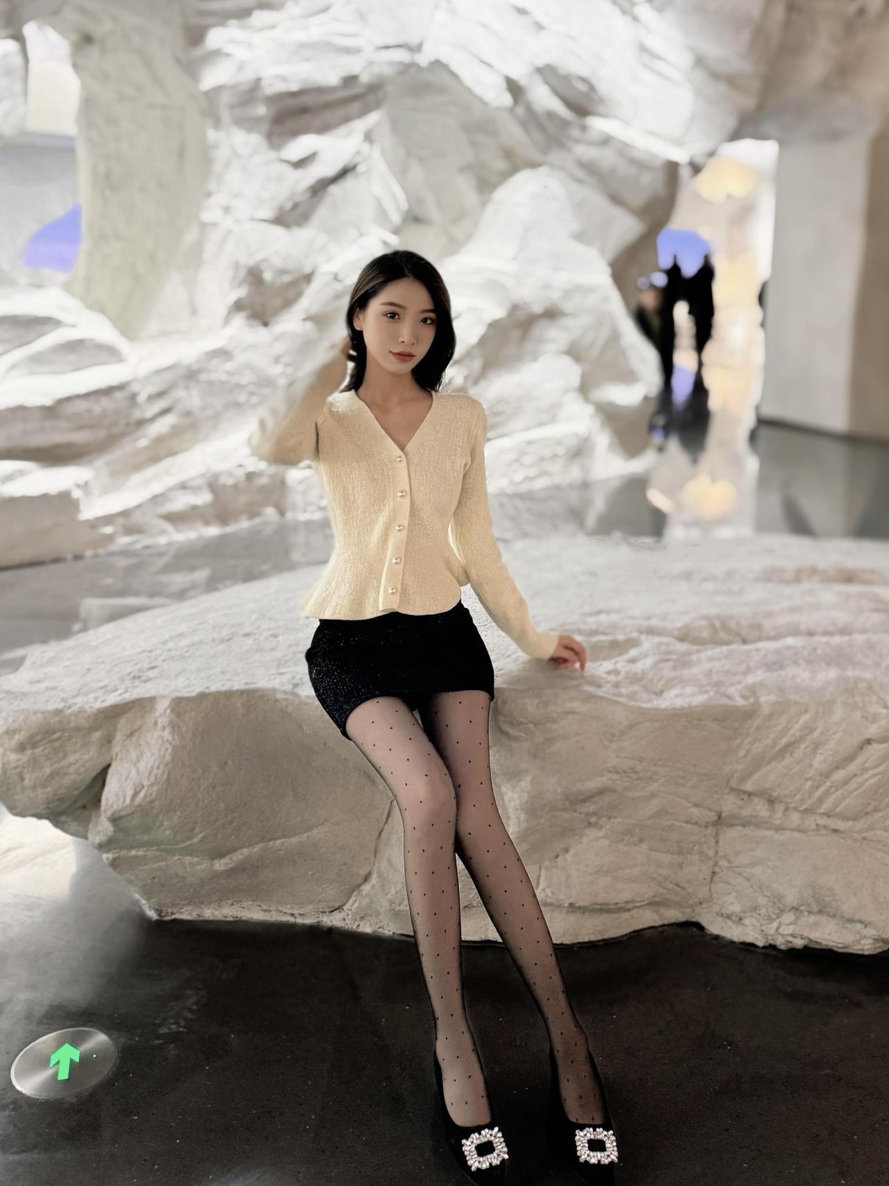 写真深V黑色衬衫搭配白色短裙真的好精致