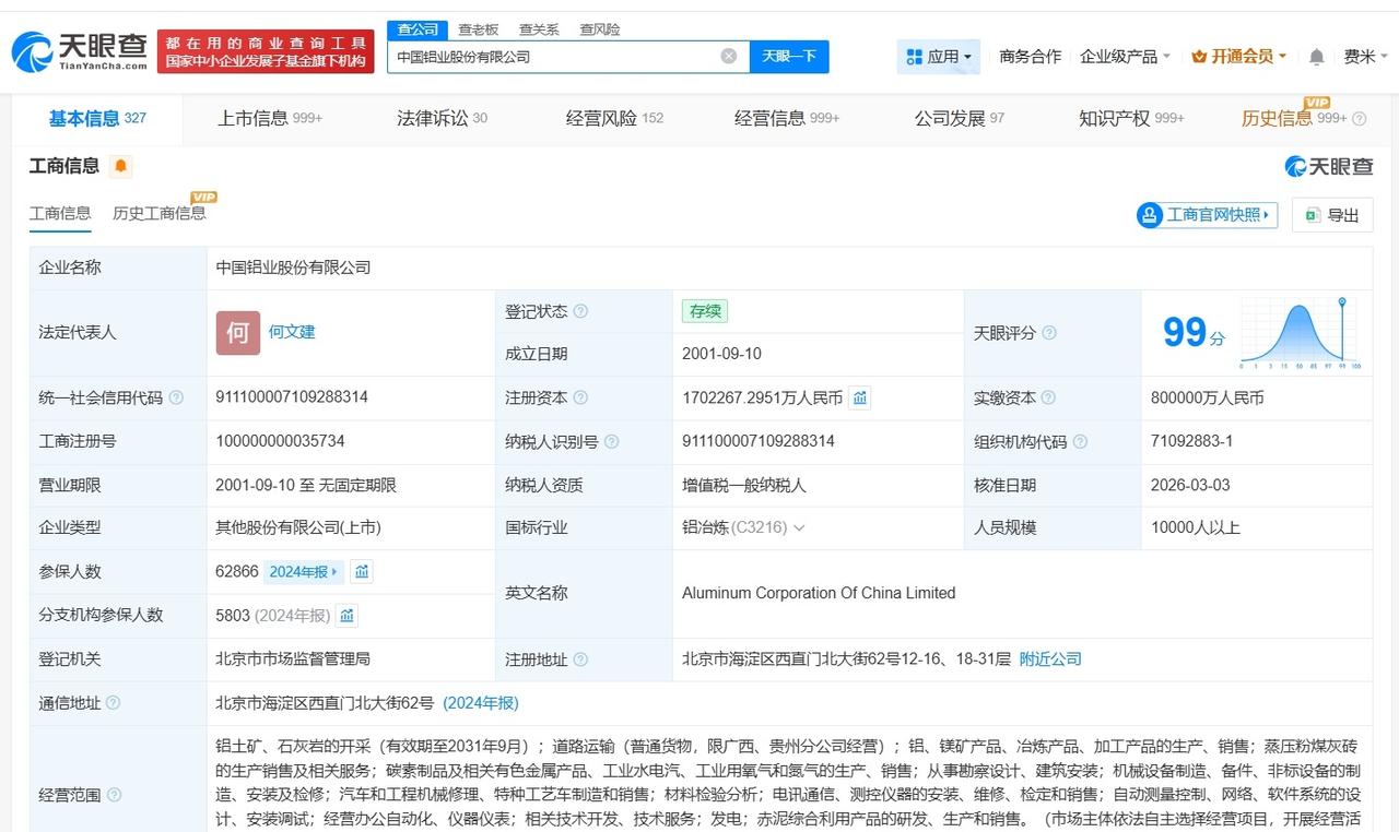 何文建任中国铝业董事长 中国铝业换帅完成工商变更 天眼查App显示,近日,中国铝
