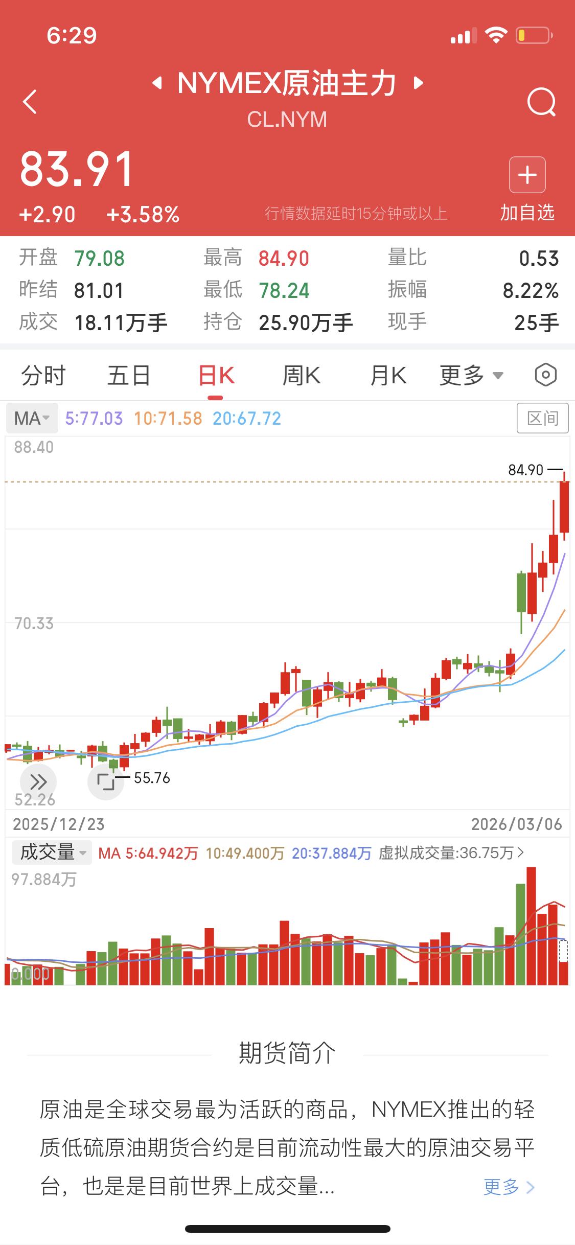 3月6日晚6点半国际原油期货涨疯了,今天中国石油下跌,可国际原油期货涨超3个点,WTI原油期货主力都冲到84美元上方了。A股周五虽反弹,但成交额萎缩,沪指小涨。 尾盘石油板块还炸板跳水,港股山东墨龙振幅超18%。之前原油期货连拉四涨停靠地缘恐慌溢价,现在“海峡没封”消息一出就变脸。这行情纯情绪炒作,没供需基本面支撑。 要是周末局势升级,下周油气板块可能疯涨,但也得警惕。从历史看,油价突破100美元后股市多回调。投资别被短期暴涨冲昏头,理性止盈止损才是王道。