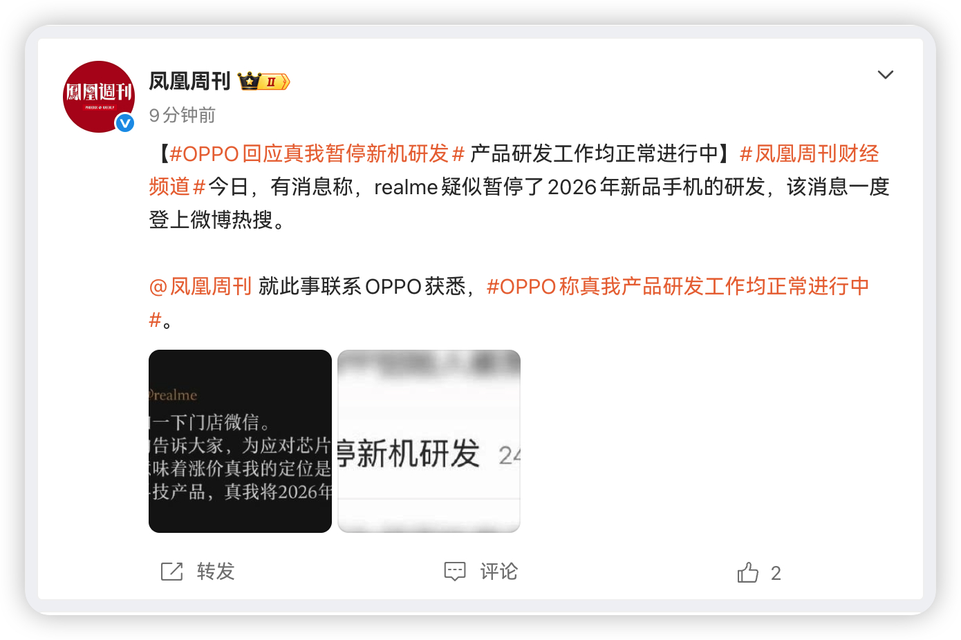 我看凤凰周刊发微博说他们跟 OPPO 求证过了,OPPO称真我产品研发工作均正常进行中 。 算是虚惊一场吧 ……