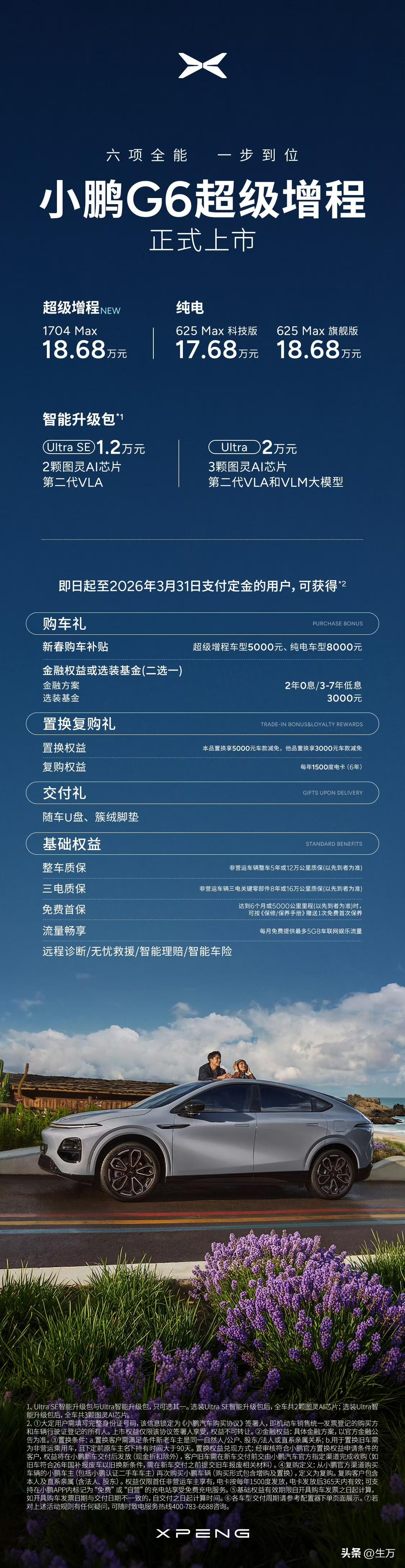何小鹏:一步到位,17.68万起,小鹏G6超级增程来了! 就在刚才,何小鹏在社交网络放出了G6好几个版本的价格,其中最便宜的17万多,这个车作为当初的网红车,在经过这几年的考验之后,这一回迎来了更新迭代。 所以买他的用户,估计最想拥有的就是看他能不能上VLA2.0,毕竟这个东西作为小鹏接下来辅助驾驶的方向,在十多万的空间里面能不能上这个车,确实是很多目标用户关心的。 而且根据他这个介绍来看,配置比较高的一颗气,可以满油满电跑到1700百多公里,再加上这个车设计的质感和用料,所以不管是他的软件硬件相结合,还是品牌力度,对这个价格来说,在目前的市场上还是比较能打的。 当然,最终行不行,还得由市场来检验,我们拭目以待吧。
