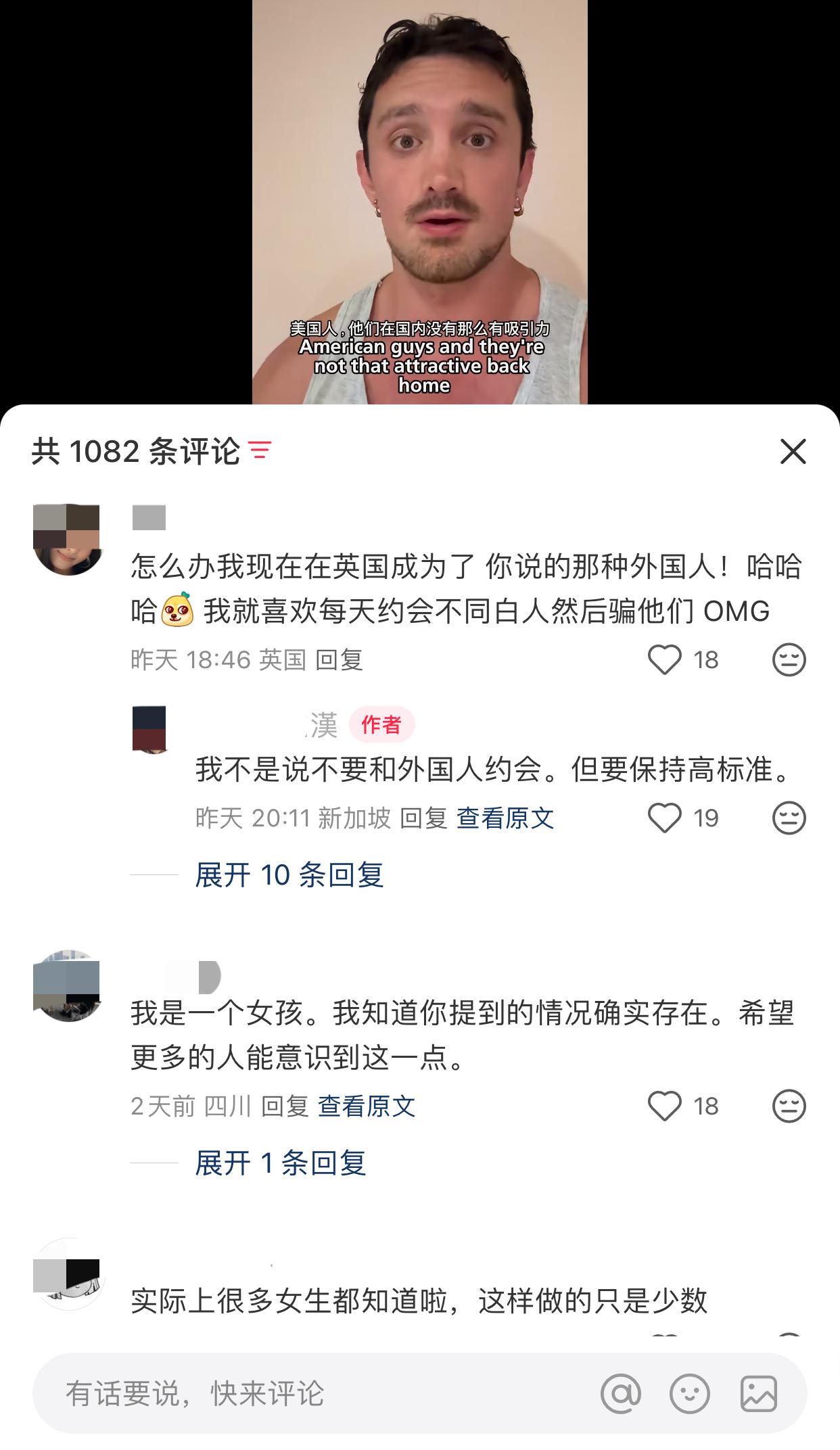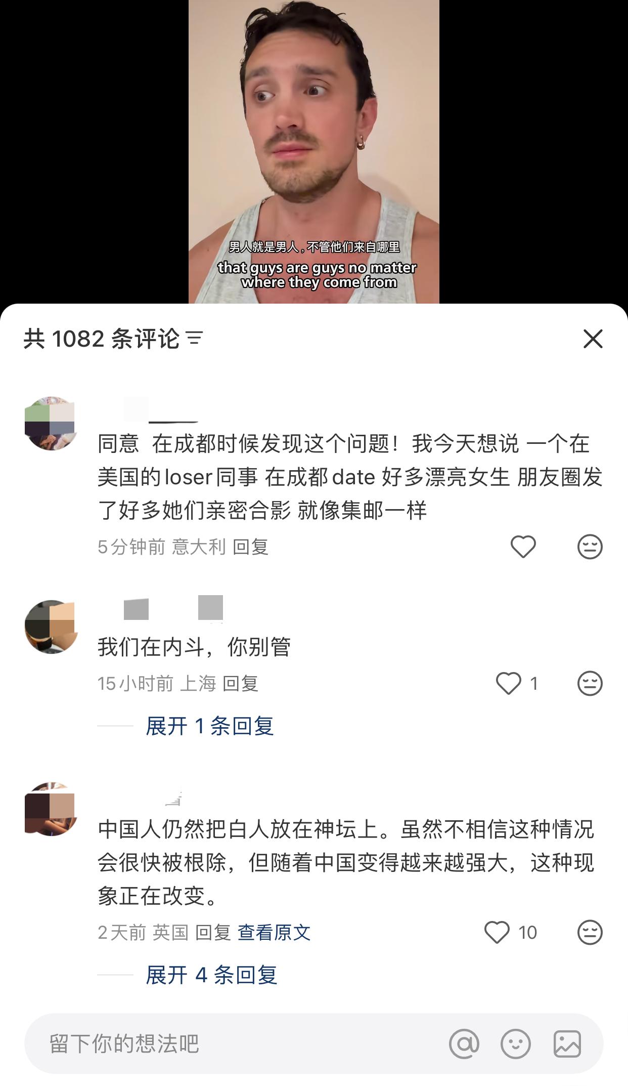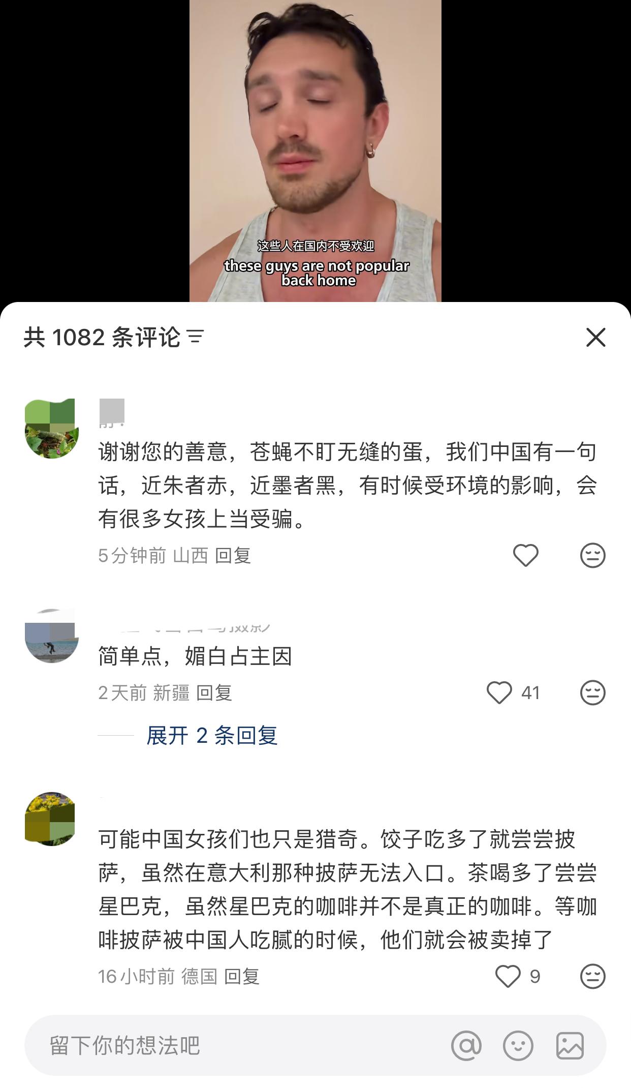 近日,一名外国男子发视频劝告中国姑娘,对所有的男人都要用同一套标准…. 起因是他听到他的中国朋友跟他说,一个欧洲人每天都和不同的女孩在一起,导致他们酒店被投诉了! 他说你们作为中国人,有着自己那么多优秀的历史文化,不应该看到外国人就觉得他们很有吸引力… 其实这些人在他们国内是没有那么多吸引力的,不应该在来到中国以后就能够享受美好而轻松的时光,为什么要给他们那么多机会,这让他感觉到很难过… 他觉得需要传播教育,男人就是男人,不管是来自哪里的,都要放在同一个标准上,外国身份并不是魅力… 有句话怎么说的,你永远叫不醒一个装睡的人,中国人口基数太大,林子大了什么鸟都有,像这些不自爱的只是极少数的一小部分,但就因这部分极少数的个人行为,影响了所有…