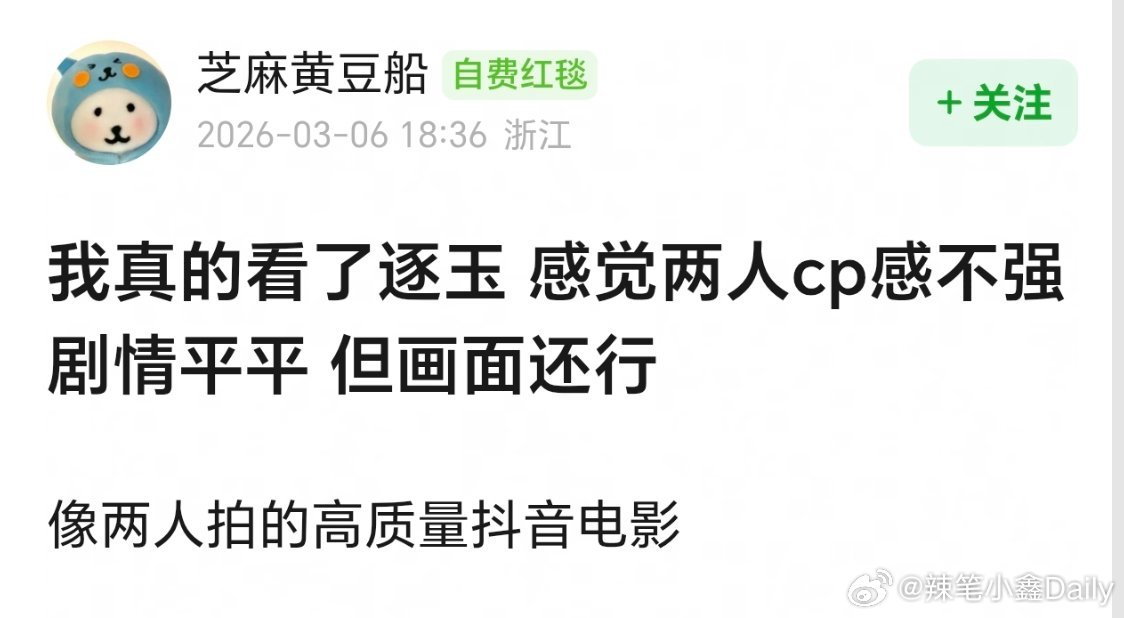 逐玉开播逐玉 热度也太假了吧,一分钟3000+,实话实说,看完一集以后,根本提不起任何兴趣,就是一部普普通通流水线古偶,男主演戏一言难尽,一丁点cp感都没有,打光也是奇奇怪怪,看这种千篇一律的古偶,还不如多看几部短剧有意思! 逐玉 顶级待遇