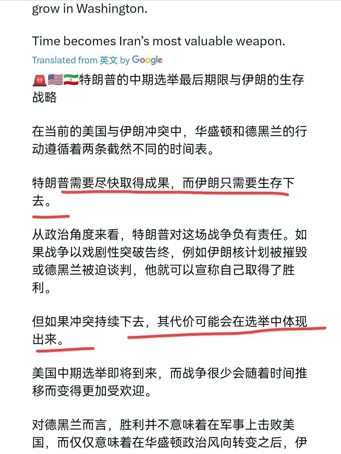*留给特朗普的时间不多了!外媒表示,伊朗很清楚自己的底牌是什么!3月6日,外媒刊文表示,当前的美伊冲突,华盛顿和德黑兰在两条截然不同的时间线上运作。特朗普需要快速的结果,伊朗只需要生存。特朗普在政治上拥有这场战争,如果战争以戏剧性的突破结束,如伊朗的核计划被拆除,或者德黑兰被迫进行谈判,他可以声称自己硬了。 说白了就是两种玩法对着干,特朗普要快,伊朗偏要慢,核心就是一个急着要结果,一个稳着保生存。对特朗普来说,时间直接关系到选票多少,更是挽回国政治声誉的关键。 当初2024大选时还说“不发动战争、只结束战争”,现在却一头扎进对伊军事行动里,身边温和派官员走了,激进顾问说了算,之前几次强硬操作尝到甜头,就以为靠武力能快速得分。 可现实狠狠打脸,原本说4周结束的行动,一周就被延长到8周,后来军方干脆要求至少打100天,甚至要拖到9月,所谓“快速胜利”根本就是空想。 特朗普现在是内忧外患两头堵,打仗成本高昂,美国财政部数据显示截至 2024 年 11 月美国国债已突破 36 万亿美元,持续军事行动将进一步加重财政负担,财政部扛不住,军方只能急着要500亿额外军费。 政治上更难堪,他 3 月 5 日称要 "亲自参与选定伊朗新领导人",被伊朗直接怼回来 "这是我们自己的事"。 盟友那边更不靠谱,欧洲不少国家明确不让美军用自己的基地搞进攻,有的甚至把美军的加油机都赶跑了,没人愿意跟着他瞎折腾,特朗普这下成了孤家寡人。 而伊朗早就摸透了特朗普的软肋... 国际原子能机构 2025 年 6 月数据显示伊朗拥有 408.6 千克 60% 丰度浓缩铀,远超伊核协议限制。 从 60% 提纯到武器级 90% 以上仍需复杂技术和时间周期,这一核能力形成了实实在在的战略威慑。这可不是吓唬人,而是实实在在的威慑,让特朗普不敢把战事闹太大。 再加上伊朗攥着霍尔木兹海峡这个能源命脉,全球四分之一的海运石油都从这过,亚洲国家进口的石油好多都得走这道。 伊朗直接不让美以的船过,还真就击中过美国油轮,用行动证明“我能卡住全球能源的脖子”。 更聪明的是,他们一边用武装力量亮肌肉,一边又说自己“遵守国际法”,既震慑了对手,又没落下话柄。 面对特朗普抛来的谈判橄榄枝,伊朗一口回绝,就是不顺着对方的节奏走,偏偏要拖到特朗普耗不起为止。 这场冲突早就不是美伊两个人的事了,全球都被卷进来,联合国相关会议上,中俄直接否决了美国想追加制裁的计划,不让他随便打压伊朗。 欧洲那边更头疼,中东打仗导致天然气价格暴涨,老百姓过日子、工厂开工都受影响,只能重新考虑自己的能源政策,之前跟着美国喊的口号也不算数了。 这其实就是现在的世界趋势,不是谁拳头硬就能说了算,单边想欺负人根本行不通。 说到底,特朗普错就错在把战争当成了选举工具,以为靠强硬就能捞选票,却忘了打仗有自己的规矩,不是想快就能快。 而伊朗恰恰看透了这一点,用核威慑、能源控制权和稳稳的心态,一点点消耗特朗普的耐心和资源。 留给特朗普的时间确实不多了,选举要等,军费要花,盟友要哄,可伊朗偏偏不按他的节奏来。 这场博弈到最后拼的不是谁更横,而是谁更能沉得住气,谁更懂现在的世界不是一家独大。很明显,时间站在那些守住自己主权、慢慢耗的一方。