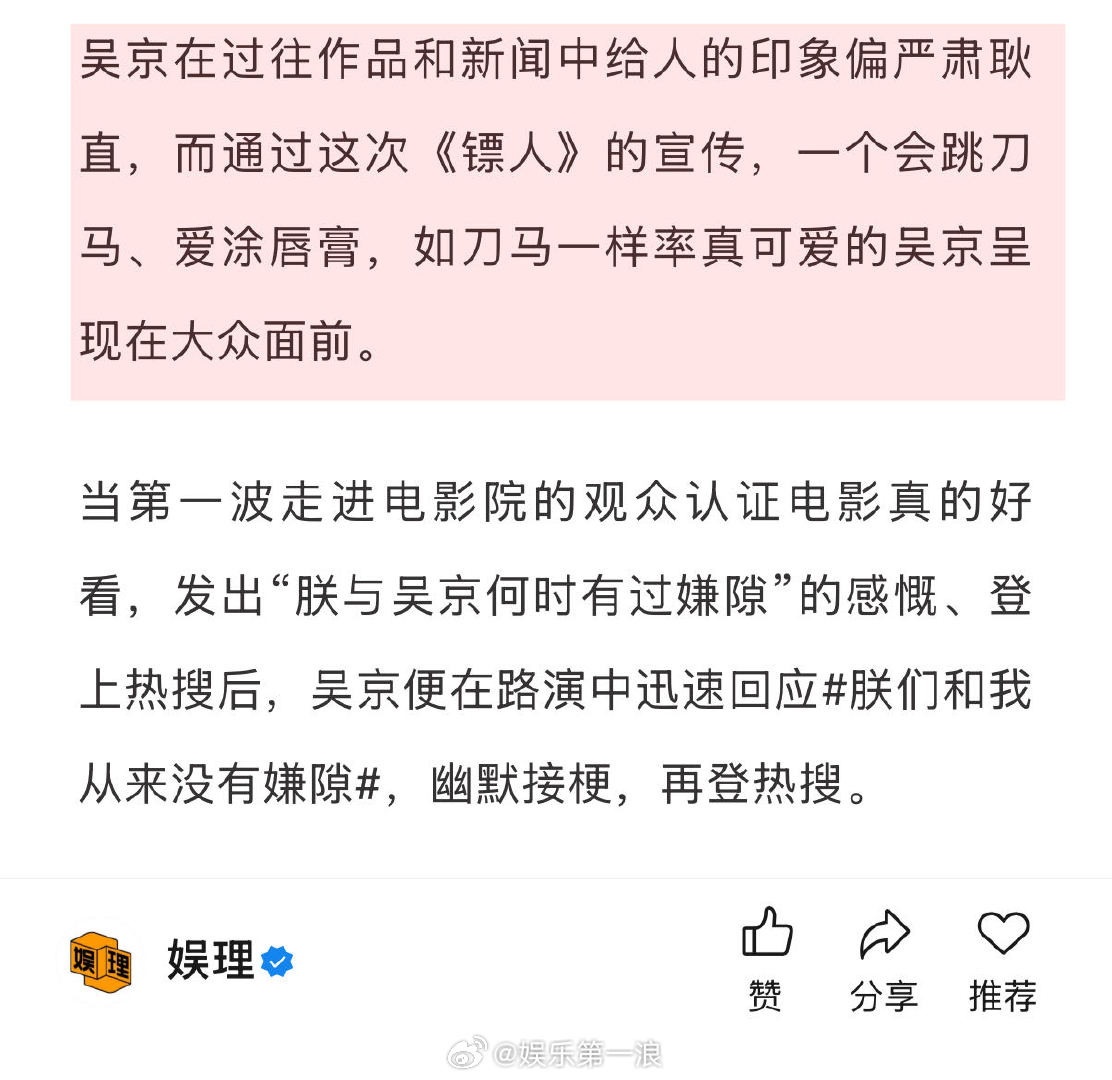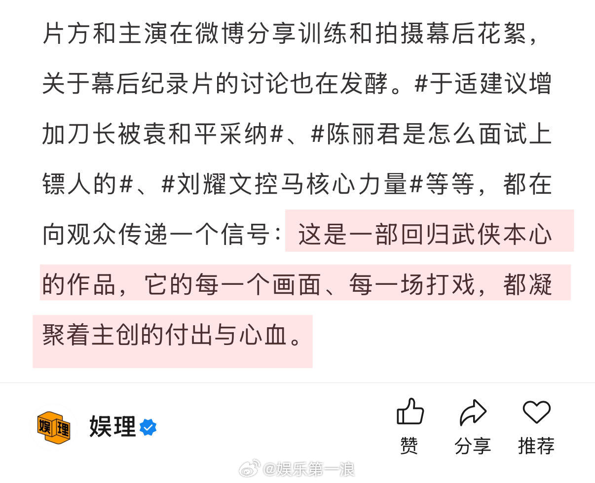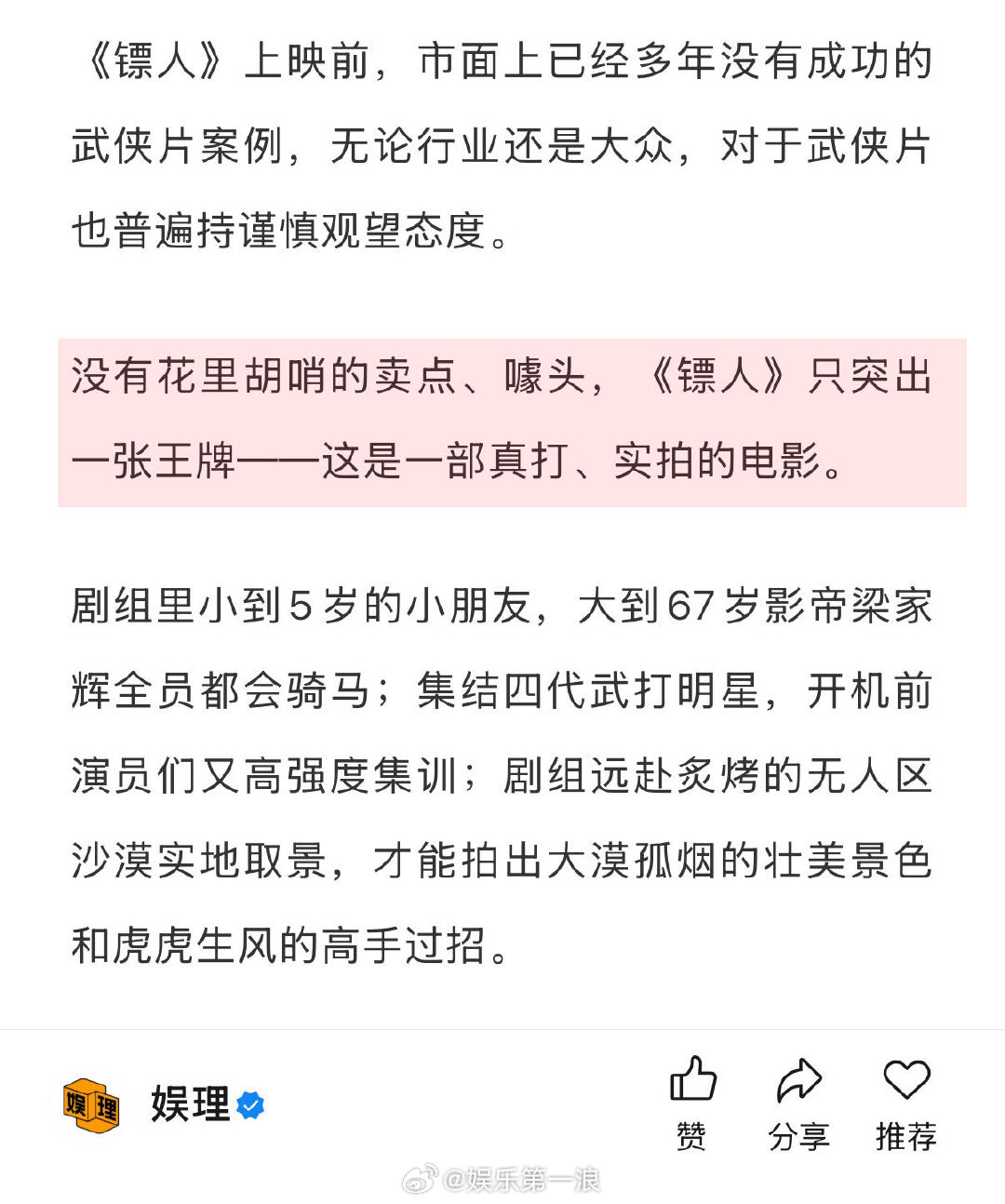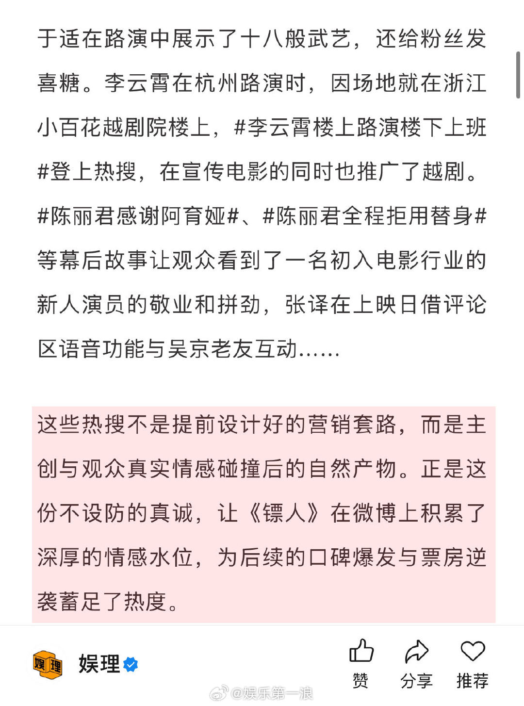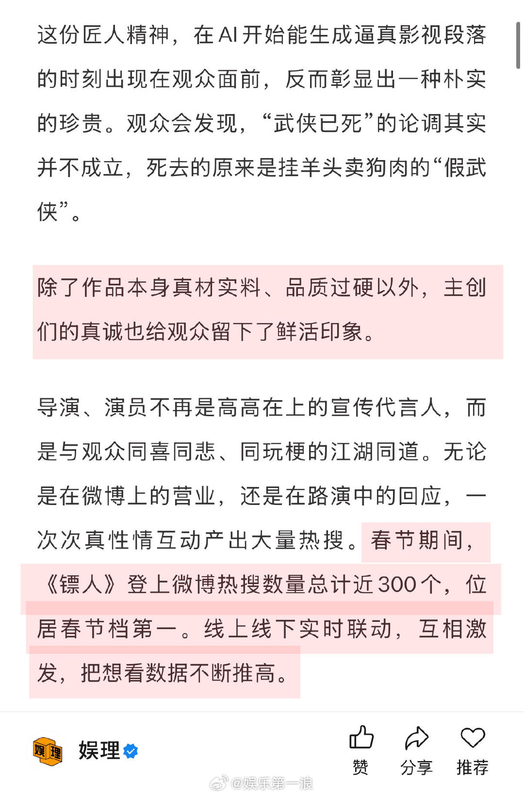 镖人为何能逆袭成功 镖人的12亿离不开自来水 除了作品本身真材实料、品质过硬以外,主创们的真诚也给观众留下了鲜活印象。导演、演员不再是高高在上的宣传代言人,而是与观众同喜同悲、同玩梗的江湖同道。春节期间,《镖人》登上微博热搜数量总计近300个,位居春节档第一。线上线下实时联动,互相激发,把想看数据不断推高…娱理独家↓