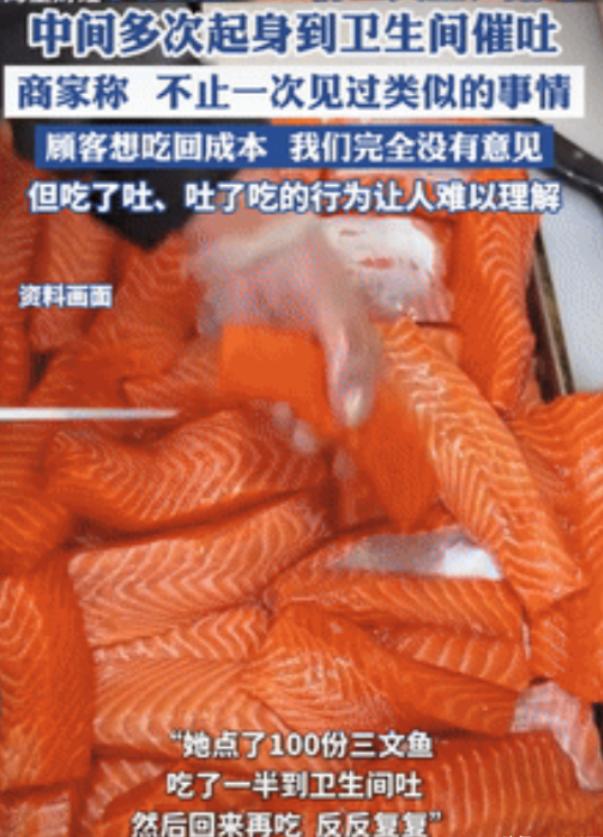 离谱!合肥自助餐厅惊现“催吐吃播”,点100份三文鱼炫完就吐,全程直播博眼球,太没底线了! 事情发生在周末中午,这家餐厅人气很旺,食客们都在慢慢享用美食。 一位二十出头的瘦小姑娘,带着手机支架落座,一上来就整了波大的。 她没像其他人那样少量多次取餐,直接点了100份三文鱼刺身,全程开着直播。 服务员一开始以为是玩笑,确认再三才敢下单,一盘盘新鲜三文鱼很快摆满桌子。 她吃起来速度飞快,几乎不咀嚼就吞咽,十分钟就空了二三十个盘子。 让人起疑的是,每过二十分钟左右,她就准时起身去洗手间,几分钟后又满血回归。 一次两次还好,反复几次后,周围食客和服务员都看明白了——这是在催吐。 这种操作在吃播圈不算新鲜,为了立“大胃王”人设,靠催吐清空胃部接着吃。 餐厅经理发现后上前提醒,她只说自己肠胃不好,转头继续对着镜头炫饭。 这场直播持续了近两小时,她全程反复进食、催吐,最后对着镜头比出胜利手势,宣称自己挑战成功。 视频发出去后,网友们直接炸了,没多少人夸她,反而全是吐槽和担忧。 有人说,这哪是吃播,就是拿身体换流量,看着都替她疼。 也有人吐槽,好好的食物吐了浪费,太缺德,还带坏风气。 更有家长表示,还好及时挡住孩子的眼睛,真怕被模仿。 其实这种催吐吃播,早就被多次曝光,风险大得很。 医生说,反复催吐会腐蚀食道和牙齿,引发胃炎、电解质紊乱,严重的会窒息猝死。 更可怕的是,长期这样会形成心理依赖,变成饮食失调症,想戒都难。 涉事餐厅后来回应,一直提倡杜绝浪费,后续会加强劝阻。 从餐饮行业从业者反馈来看,这类催吐吃播并非个例,不少自助餐厅都曾遇到过类似的浪费行为,让人无奈。 根据反食品浪费法,这种宣扬暴饮暴食的行为本就违规。 中国消费者协会也早就倡议,抵制极端吃播,平台该下架这类内容。 流量再香,也不能拿健康和公德换。毕竟一时的热度,换不来长久的安稳。 希望这场闹剧能给吃播们提个醒,也让更多人明白,健康饮食、珍惜粮食才是正道。 信源:大皖新闻《女子吃自助餐点100份三文鱼,吃了吐,吐了吃,餐厅:完全不能理解》 闪电新闻客户端《女子吃自助餐点100份三文鱼 吃了就吐 吐了又吃?》