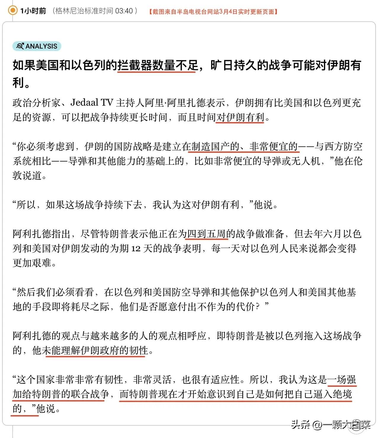 特朗普的“酗酒者性格”终于把自己逼入绝境,他现在的言论已经语无伦次,竟然声称美国拥有无尽的战争资源,也许都忘记缺什么土了。美国部署在中东的拦截弹已经接近耗尽,而伊朗的先进导弹仍未大量使用,伊朗的无人机数以万计,这些无人机在俄乌战场上已经改写现代战争规则。现在,轮到中东的美国大兵来品尝新战争的滋味了——被无穷无尽的无人机狂轰滥炸! 特朗普这番“无尽资源”的豪言,听起来更像是一个赌徒在输光筹码前的自我催眠。现实情况是,美军的弹药库正在以惊人的速度见底。根据美国军方内部泄露的消息,如果对伊朗的袭击持续超过10天,一些关键导弹的库存可能会开始告急。这可不是危言耸听,而是摆在五角大楼桌面上的残酷算术题。 “萨德”反导系统的拦截弹,全球现役的只有9套,拦截弹总采购量不足650枚。在去年6月仅仅12天的以伊冲突中,美军就消耗了约150枚,占了总库存的近四分之一。这次冲突强度更高,消耗只会更快。有分析指出,按当前消耗速度,“爱国者”拦截弹库存甚至可能撑不过4天。美军中央司令部司令库珀承认,过去近100个小时的行动,已经投放了2000多枚弹药。这种消耗速度,别说“无尽资源”,就连维持基本的防御都捉襟见肘。 为什么拦截弹消耗这么快?因为伊朗的战术太“聪明”了,或者说,太“便宜”了。他们完美复制了俄罗斯在乌克兰的战术:用廉价的无人机海,去消耗对手昂贵的防空导弹。一架伊朗的“沙赫德-136”自杀式无人机,成本大概2万到5万美元。而美军用来拦截它的一枚“爱国者”导弹,造价高达300万到400万美元。这账怎么算都是血亏。你用价值400万美元的导弹,去拦截一个2万美元的目标,交换比是200:1。伊朗的月产能超过500架,一天就能造400架。美军就算有金山银山,也经不起这种“赔本买卖”式的消耗。 更让美军头疼的是,伊朗的无人机还在升级。新投入的“哈迪德-110”高速隐身无人机,速度是“沙赫德-136”的近三倍,还采用了隐身设计,雷达很难发现。这就把防空系统的反应时间压缩到了极限。传统的防空系统是为拦截高空高速的弹道导弹设计的,对付这种低空、慢速、小目标,本来就吃力,现在对方还提速加隐身,简直是防不胜防。 美国防长赫格塞斯最近不得不承认,美军无法完全拦截所有来自伊朗的无人机袭击。这句话等于撕下了美军“绝对防御”的神话外衣。当防御一方亲口承认防不住的时候,战争的天平就已经开始倾斜了。这不是技术不行,而是经济账和数量账算不过来。你的防御体系再先进,也是由一个个昂贵的节点构成的。而对方的攻击,是成千上万架廉价的、可以随时补充的“消耗品”。 这场消耗战的影响是全局性的。为了给中东“补血”,美军已经在考虑拆东墙补西墙,把驻韩美军的“爱国者”和“萨德”系统调往中东。但这会直接削弱美国在亚太地区的防御,让韩国等盟友陷入安全焦虑。同时,消耗在中东的拦截弹,也正是乌克兰急需的救命弹药。美国陷入了两线作战的资源困境:既要应付中东的伊朗,又要支持欧洲的乌克兰,自家的弹药生产线却跟不上消耗的速度。“萨德”拦截弹的年产能只有37枚,补上去年消耗的150枚缺口就需要4年多时间。 特朗普所谓“无尽的战争资源”,在伊朗的无人机蜂群和导弹雨面前,成了一个苍白的笑话。现代战争的规则确实被改写了,但方向可能和他想象的相反。优势不再仅仅属于拥有最昂贵、最精密武器的国家,而是属于能更快、更便宜地制造和消耗武器的国家。当战争变成一场比拼工业耐力和成本控制的“数学题”时,传统的军事霸权就遇到了真正的挑战。中东的美军基地,正在成为这个新战争逻辑的试验场。 各位读者你们怎么看?欢迎在评论区讨论。