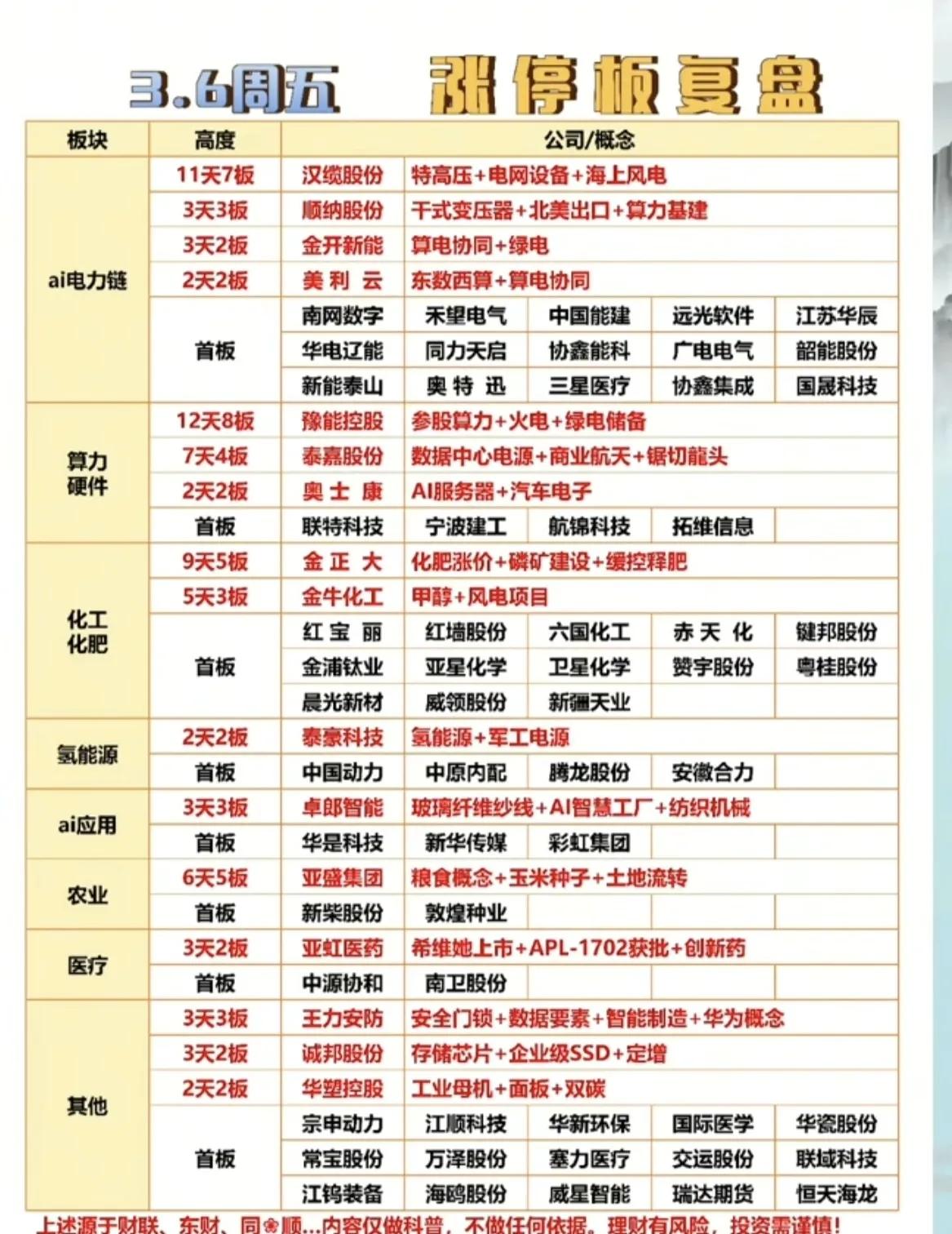 3月6日,周五A股涨停板复盘:AI电力链与算力硬件成核心主线!!! 3月6日,A股涨停梯队呈现“高标引领、板块共振”的格局,AI电力链与算力硬件成为市场最强主线。 AI电力链方面,汉缆股份以11天7板的超强走势领衔,顺钠股份、金开新能分别实现3连板与3天2板,南网数字、中国能建等多股首板涨停,形成从高标到首板的完整梯队。算力硬件板块同样强势,豫能控股12天8板,泰嘉股份7天4板,奥士康2连板,联特科技、航锦科技等首板助攻,算力+绿电的复合逻辑获资金深度认可。 化工化肥、氢能源等板块亦有表现,金正大9天5板、金牛化工5天3板,泰豪科技2连板。整体来看,市场短线情绪集中于AI赋能的电力与算力赛道,高标股持续打开空间,板块轮动有序!!!
